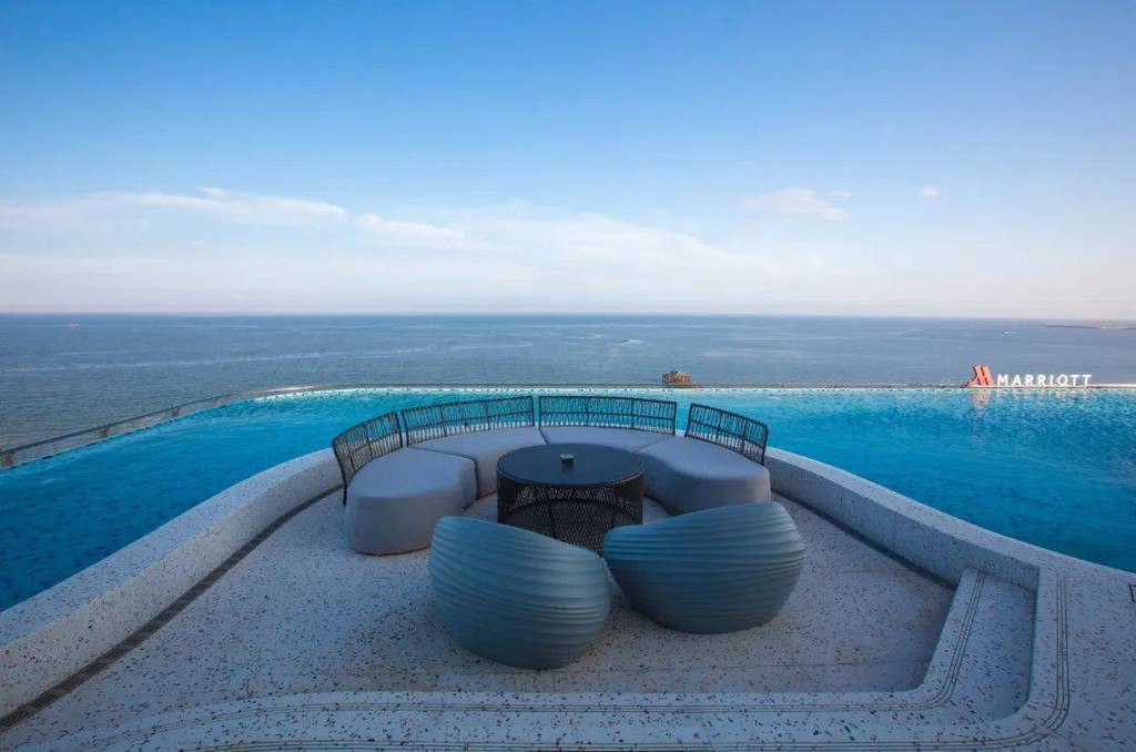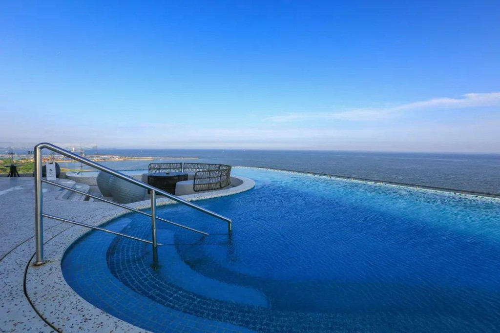 赶上晴朗的天气,无边际泳池与海平面呈现出海天一线的景象,随手一拍都是封面级大片,想必这里就是华北地区顶级的网红泳池了吧。