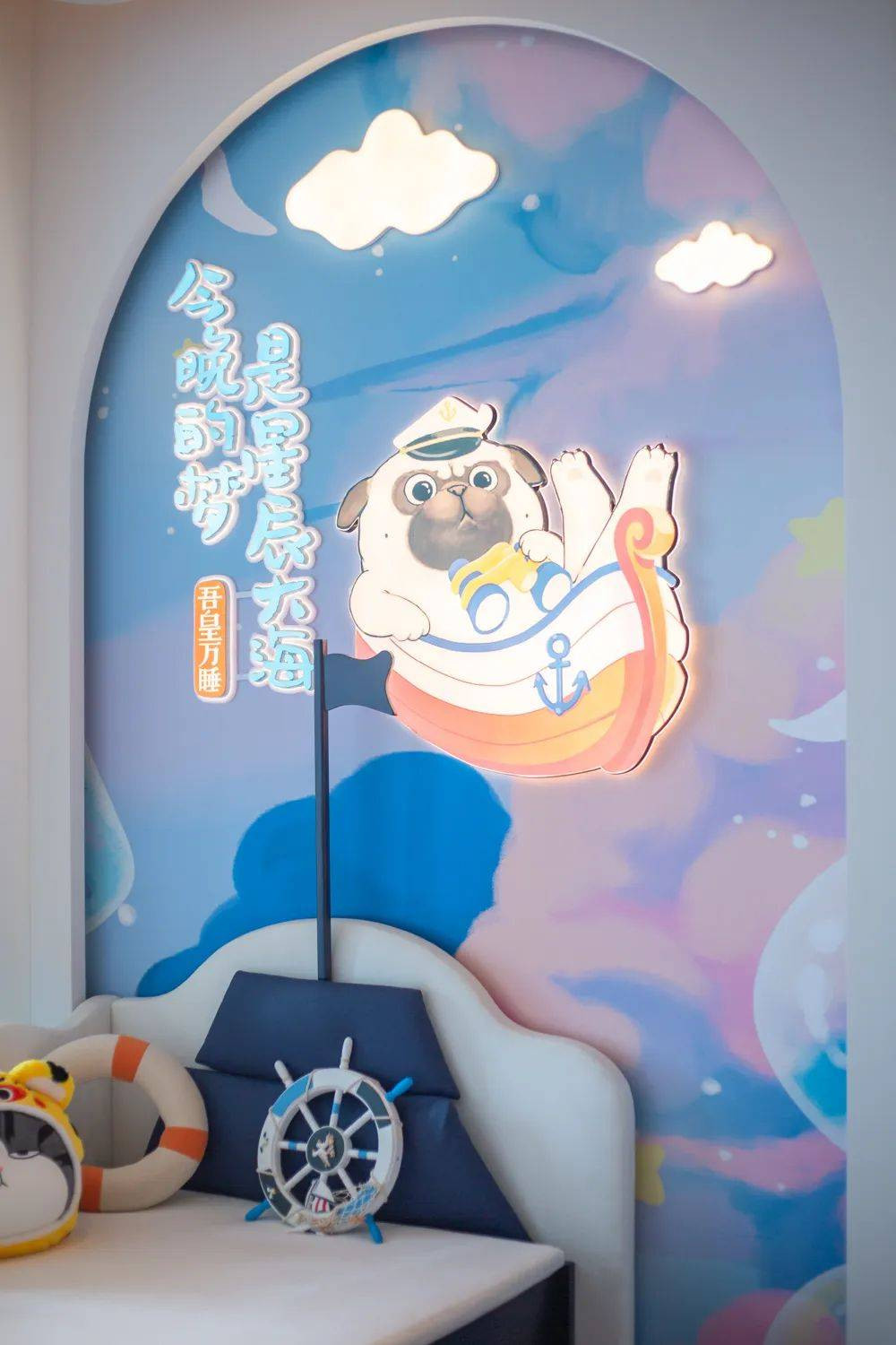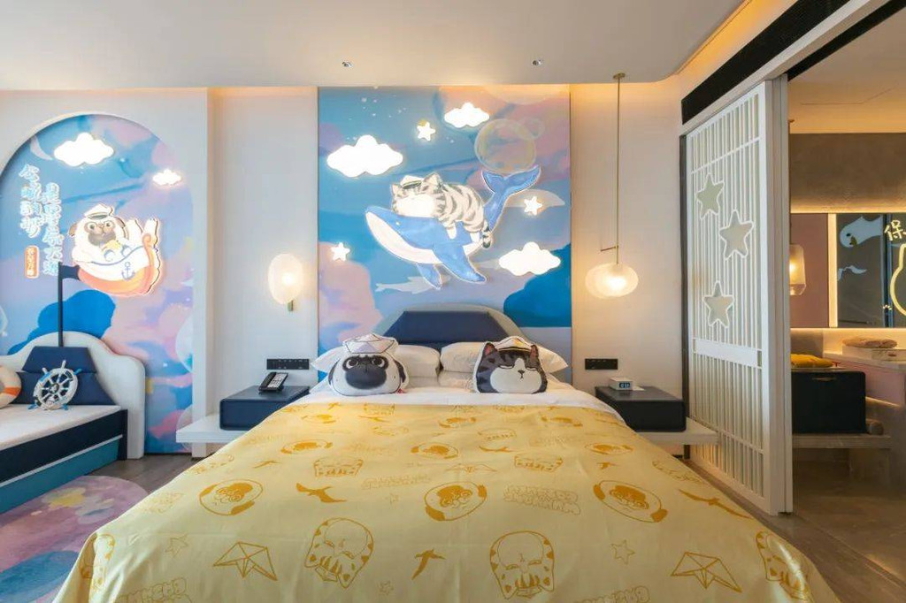 前面提到过酒店有吾皇猫周边的纪念品店,如果要深度体验两者碰撞的火花,就不要错过与插画绘本“吾皇猫”合力打造的主题客房(10间),共有船长之梦和梦幻人鱼两大主题,一蓝一粉,内饰俏皮幽默,适合带娃来打卡。