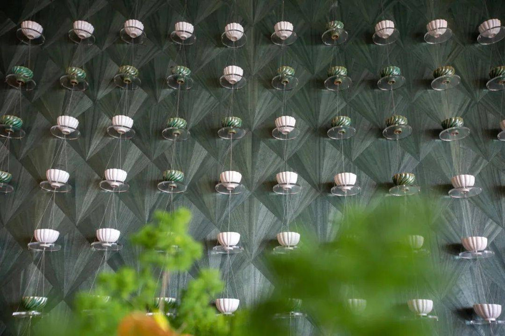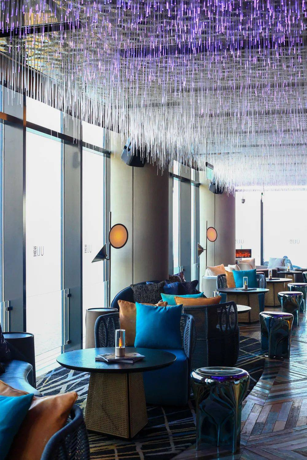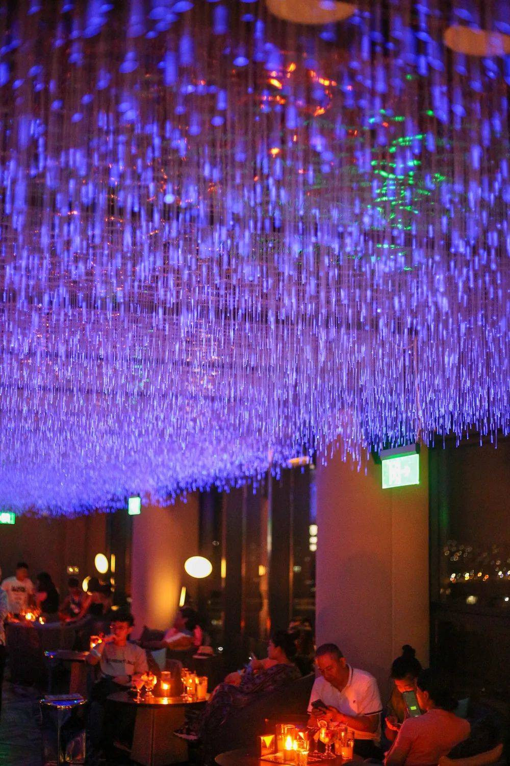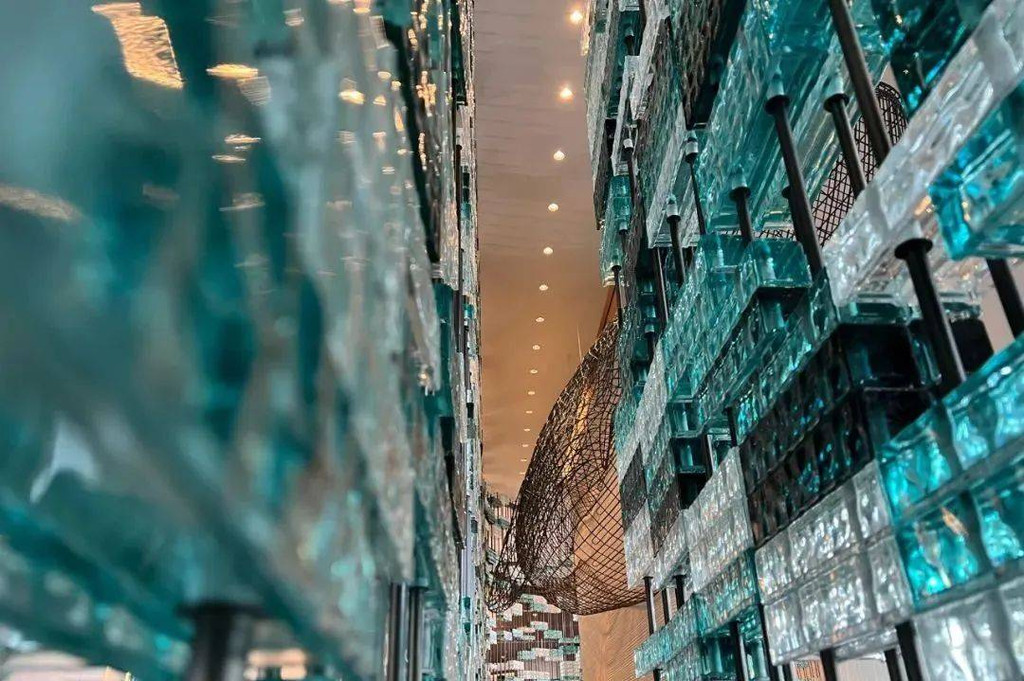 在酒店客房区域,有两处灯光装饰也非常值得打卡,三楼的垂直吊灯群,宛如夜空繁星点点;而另一处的形状酷似腾龙的灯饰还会变化不同的色彩。