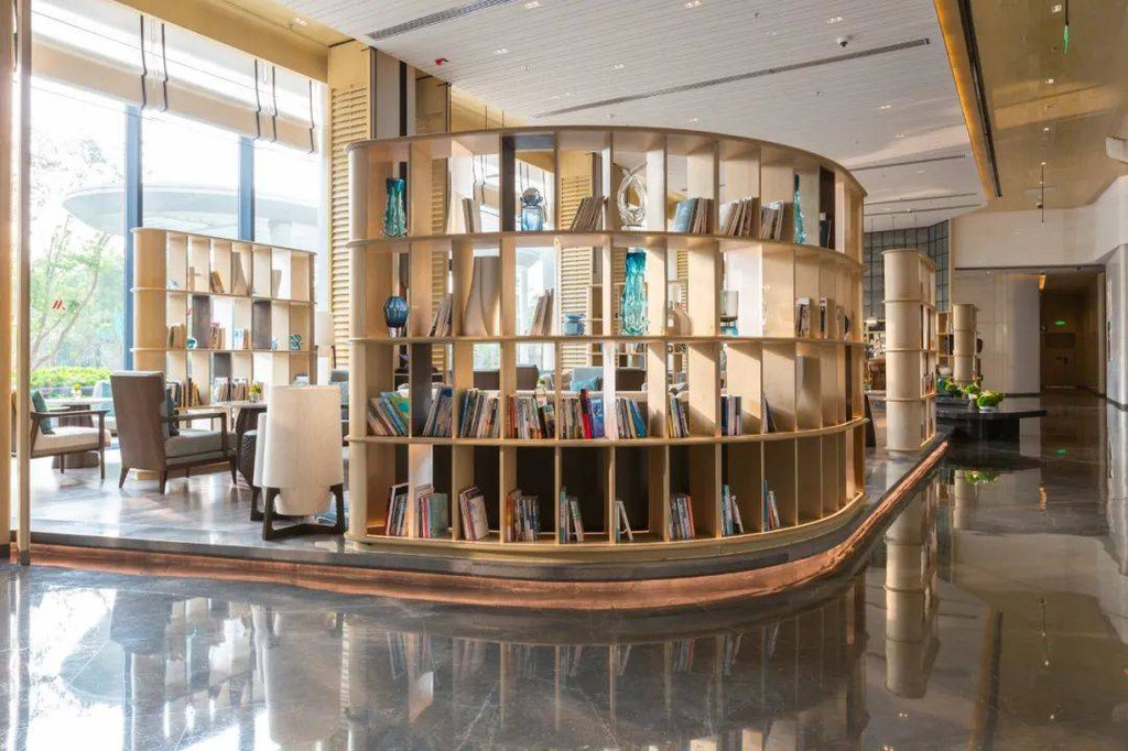 大堂吧的设计也非常巧妙,引入书架的形式,不仅一下提升了文化感,也确保了客人使用的私密性,在此来上一杯咖啡、一块蛋糕,再翻翻书架上的书籍,生活感十足。