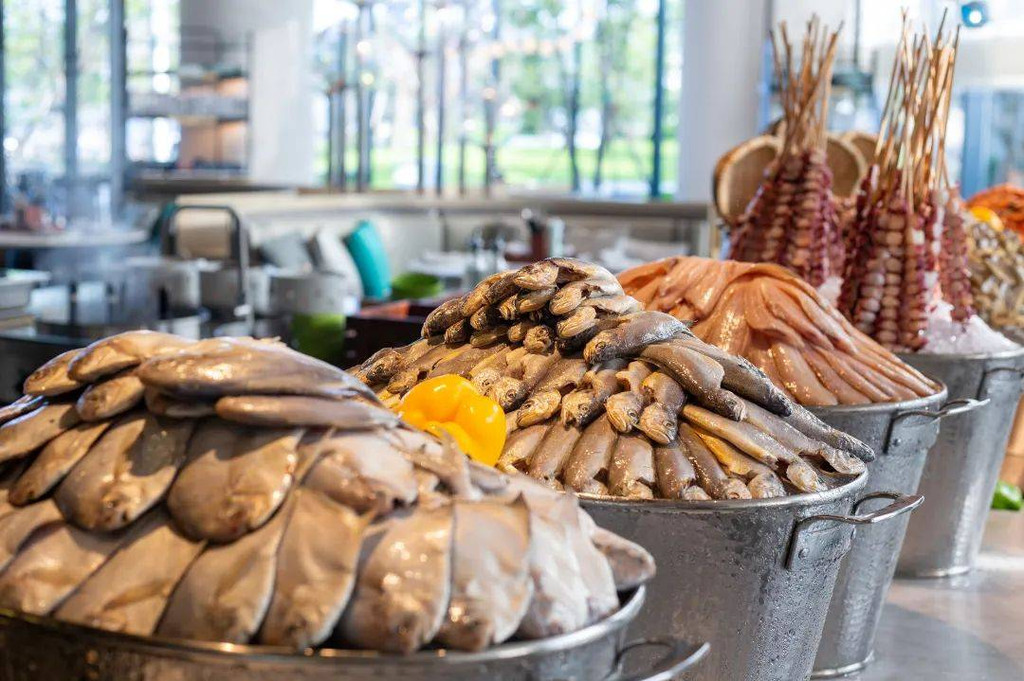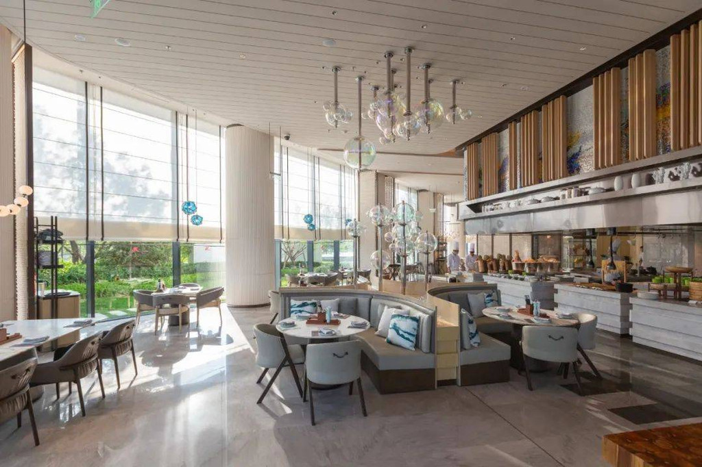 当你看到满是深海鱼群的屏风墙,就知道此刻正身处臻厨全日制餐厅。这个“海底世界”般的全日餐厅,设有开放式厨房,提供有品类丰富的早餐和晚餐以及中午的半自助餐。