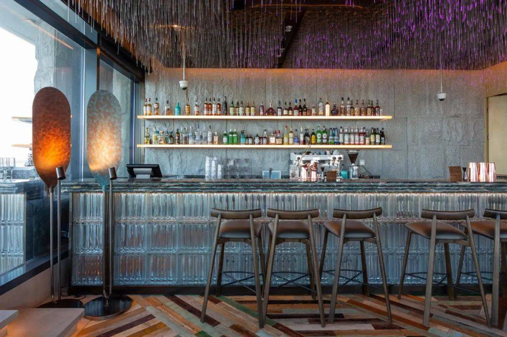 线形的灯光宛如流星,非常绚烂,一边品尝调酒师特调的鸡尾酒,一边欣赏窗外的旖旎海景,这才是度假。这里也充当起池畔吧的角色,移步户外泳池,在泳池边吹着海风,欣赏美景,品酌美酒,又何尝不是一件乐事。