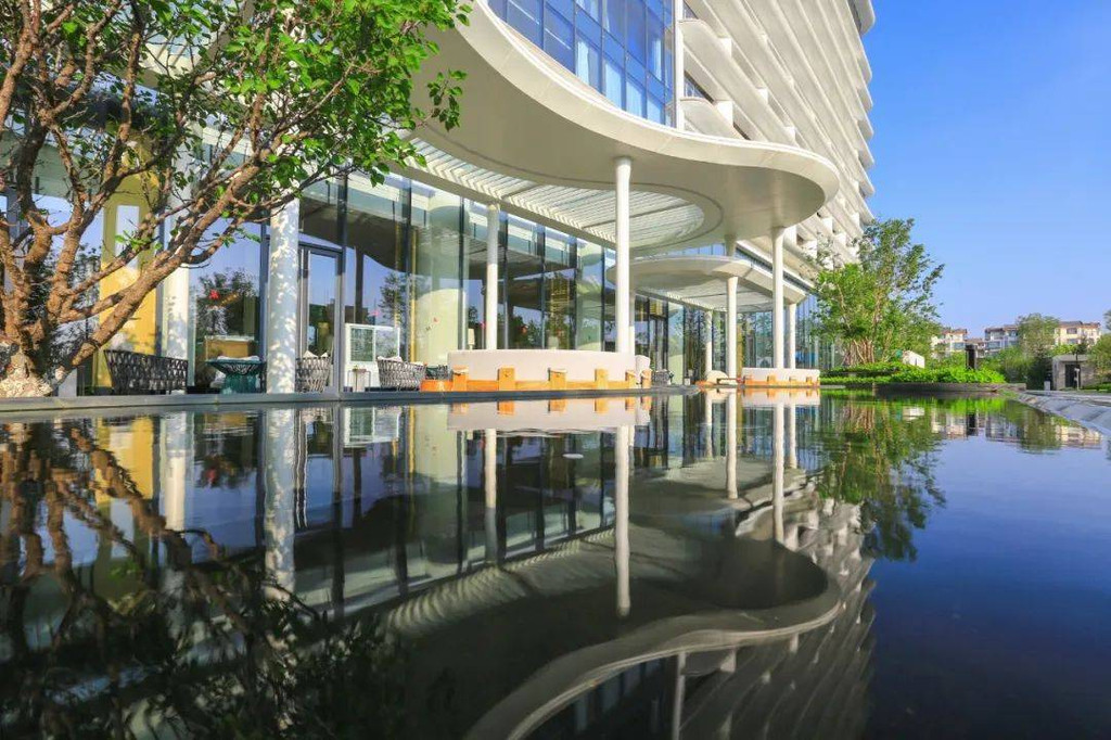 驱车抵达酒店落客区域,目光不自觉地就会被一组特色水景所吸引,它被称为“海潮之声”,虚实相结合的弦月造型非常抢眼,不同光影下也会呈现出不同的视觉效果。