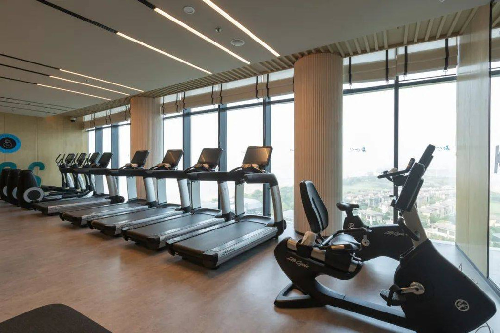酒店顶楼的健身房,住客可凭房卡进入,健身房紧邻室内泳池,宾客在跑步锻炼的同时,同样能欣赏到窗外的壮美景观。