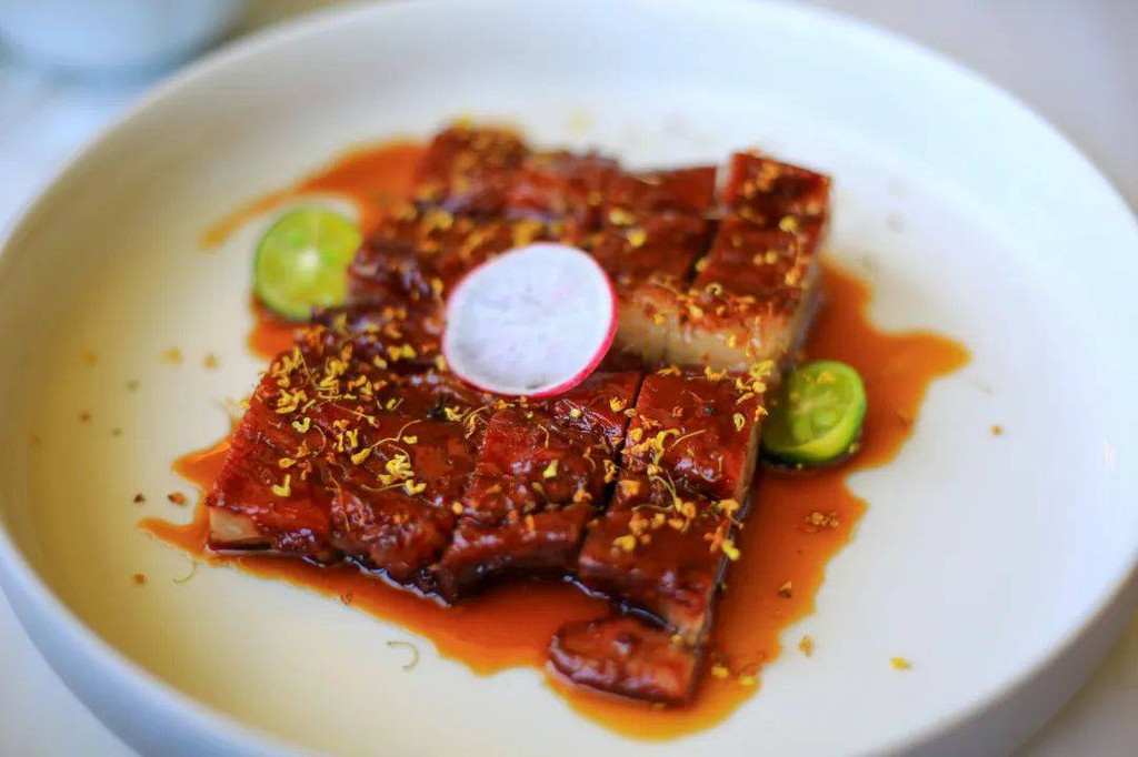 山海之间的餐厅自然是从山珍到海味俱全的。招牌的蜜汁叉烧皇,裹满了甜蜜酱汁,肉质厚实、肥瘦相间,是粤式烧味的代表之作。红焖黄花鱼选用东海原生黄花鱼,采用招牌的红焖做法,在保留海鲜原味的同时让口感更为扎实,是典型的本地味型。