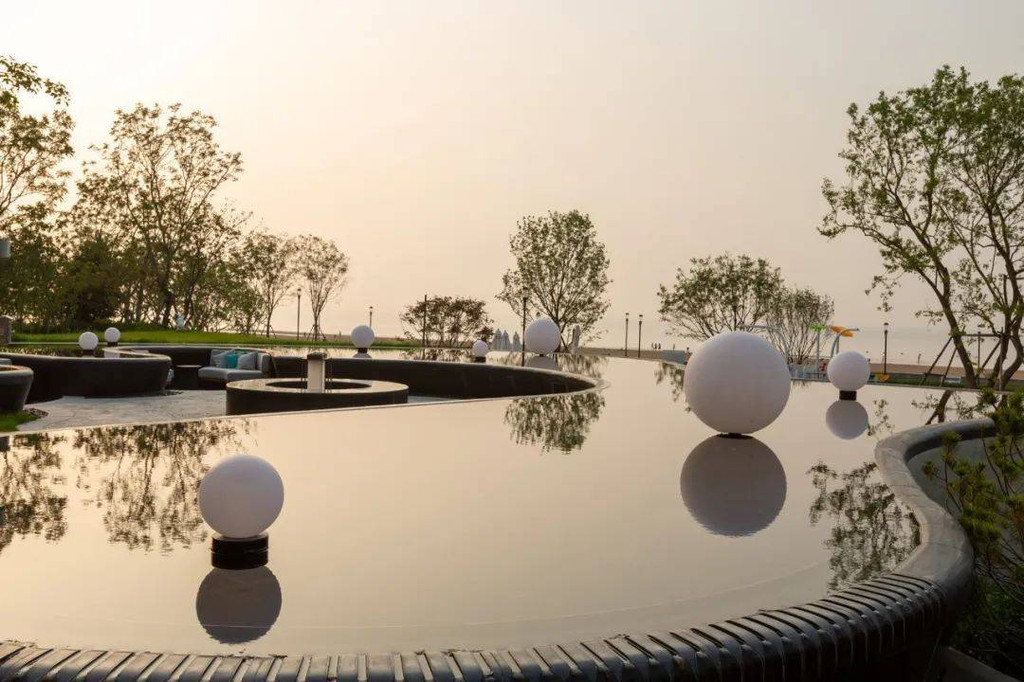 而自助餐厅和大堂吧户外区域的水景也非常漂亮。我很喜欢浮光梦境池区,白色的球在晨光下倒影出来让人忍不住想多拍几张,而到了黄昏的时候,坐在这里欣赏醉美夕阳又是另一种享受。