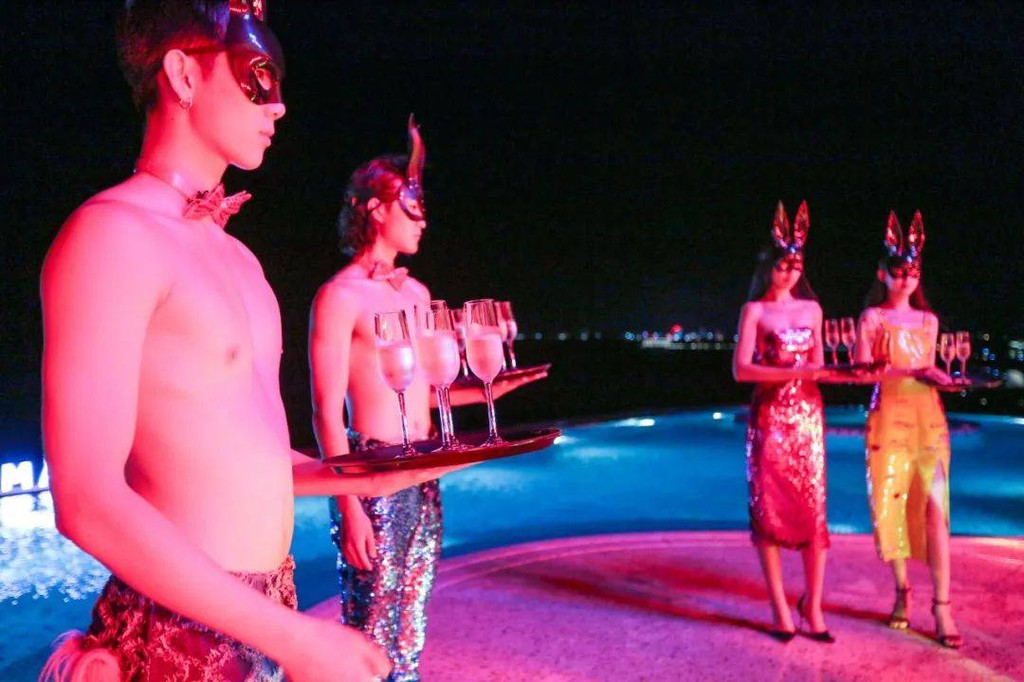 如果你喜欢喝酒,如果你喜欢音乐,如果你也喜欢热闹,那么鎏酒吧非去不可!鎏酒吧与无边际室外泳池相连,金属质感的墙体和流光溢彩的灯光,旧船板为原材料而打造的地板,时尚复古。白天与夜晚,这里呈现出不同的氛围,可奶可盐,令人迷醉。