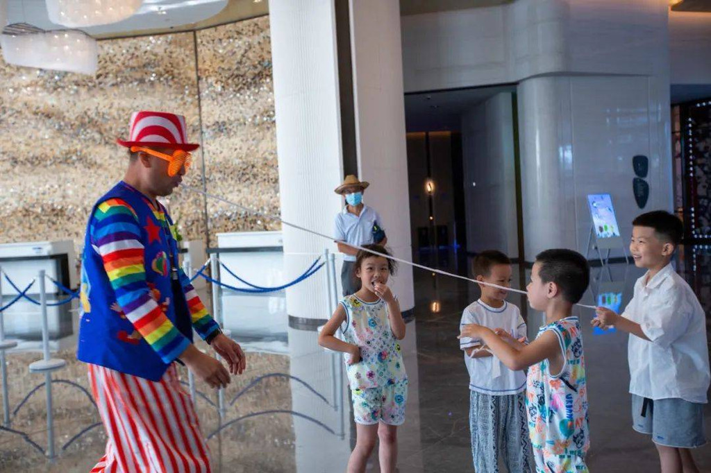 有时候还会在大堂邂逅由工作人员扮演的小丑与小朋友们玩游戏变魔术;电梯入口处还设置了3D投影,将深海环境映入其间,小朋友们可与“海洋动物”零距离接触。