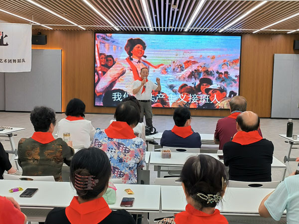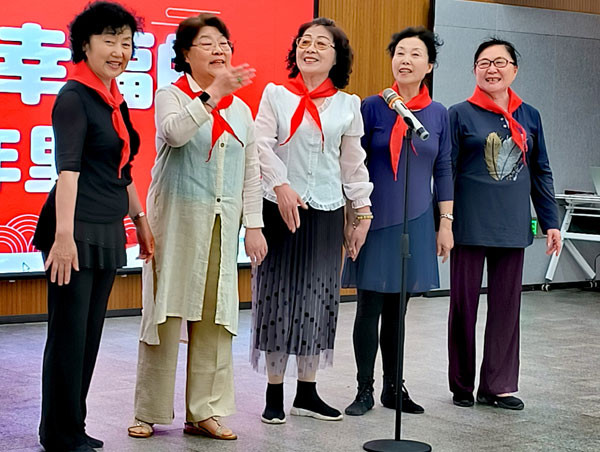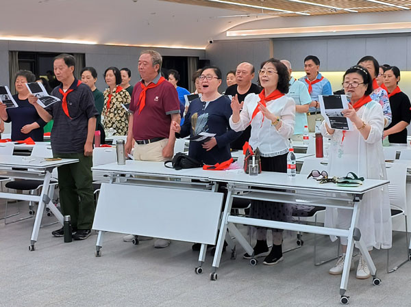 开场首个节目在领队邹小霏的指挥下,全体兵团战友进行儿歌联唱。在中央人民广播电台《小喇叭》开始曲的引子下,《坐火车》《让我们荡起双浆》《花儿朵朵》《小白船》《上学歌》《我们的田野》《小燕子》《接过雷锋的枪》《我们是共产主义接班人》等二十多首,这些当年陪伴自己成长的长达半小时的儿歌,他(她)们佩戴着红领巾,一个个神采飞扬,激情迸发地放声歌唱,开心的喜悦洋溢在每个人的脸上。
