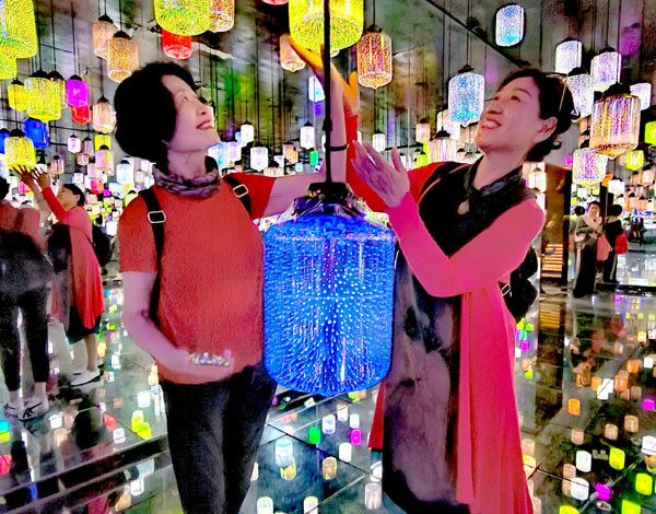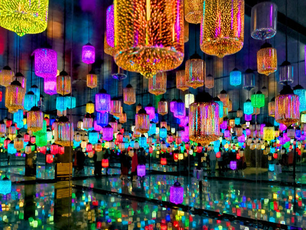 在这里的有限空间里放置了多块大面的镜子,当人们置身于其中,自己的身影在镜像反射中,一个又一个无止境向外拓展,让你感到犹如漂浮在宇宙星云之中,一切都流光溢彩,宛如仙境。