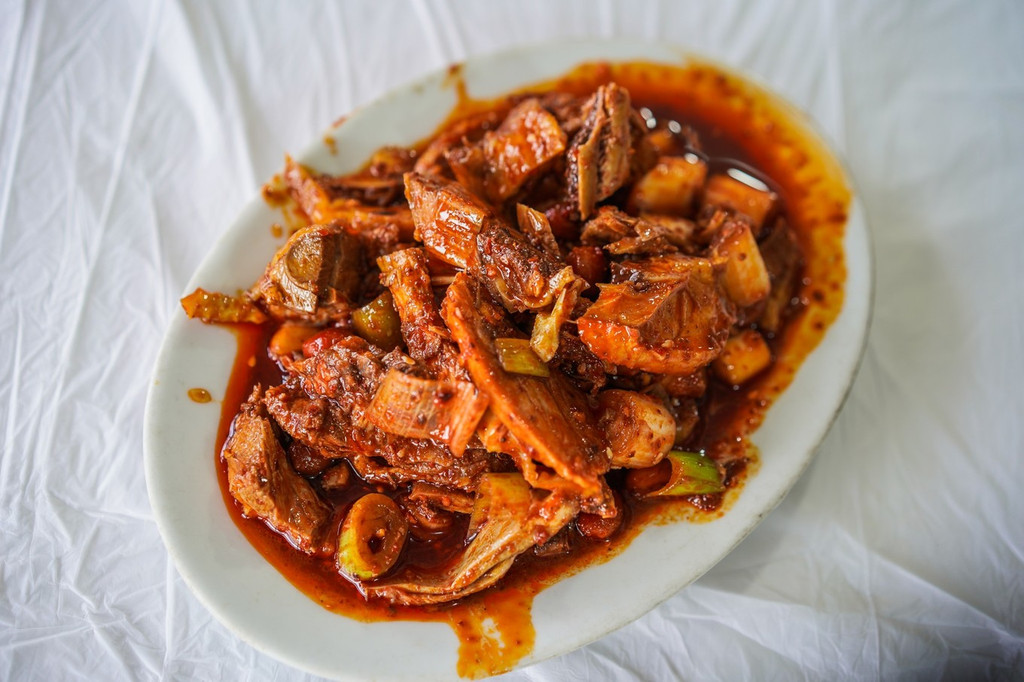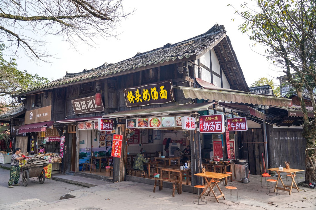 邛崃 的三 大名 小吃,奶汤面、钵钵鸡、毛血旺,在古镇随便一条街都能找到。
