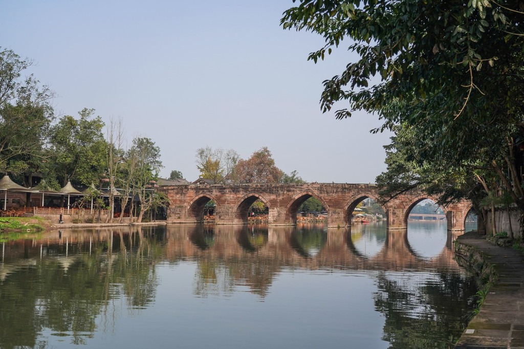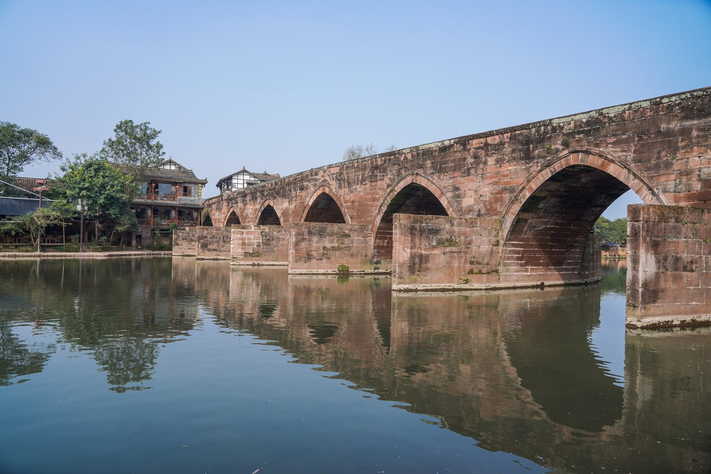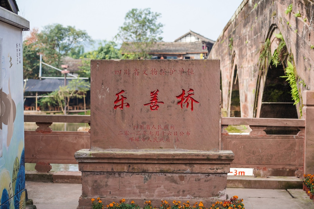 乐善桥建于清同治元年,由乡贤周潼宣、张大宾等人出资修建。七年采石,到竣工整整花了十年时间。桥分七孔,为桃形,总长120米,高16.6米,宽10米,是 四川 现存规模最大的古代石拱桥。