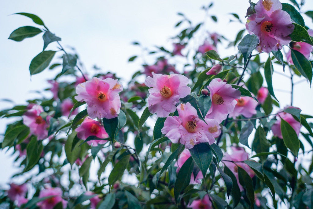 粉红色的茶花也开放了。
