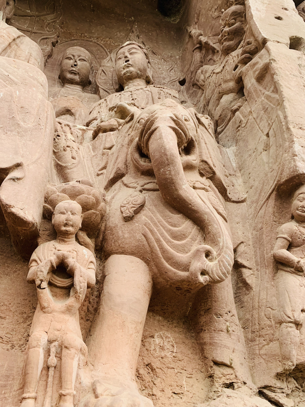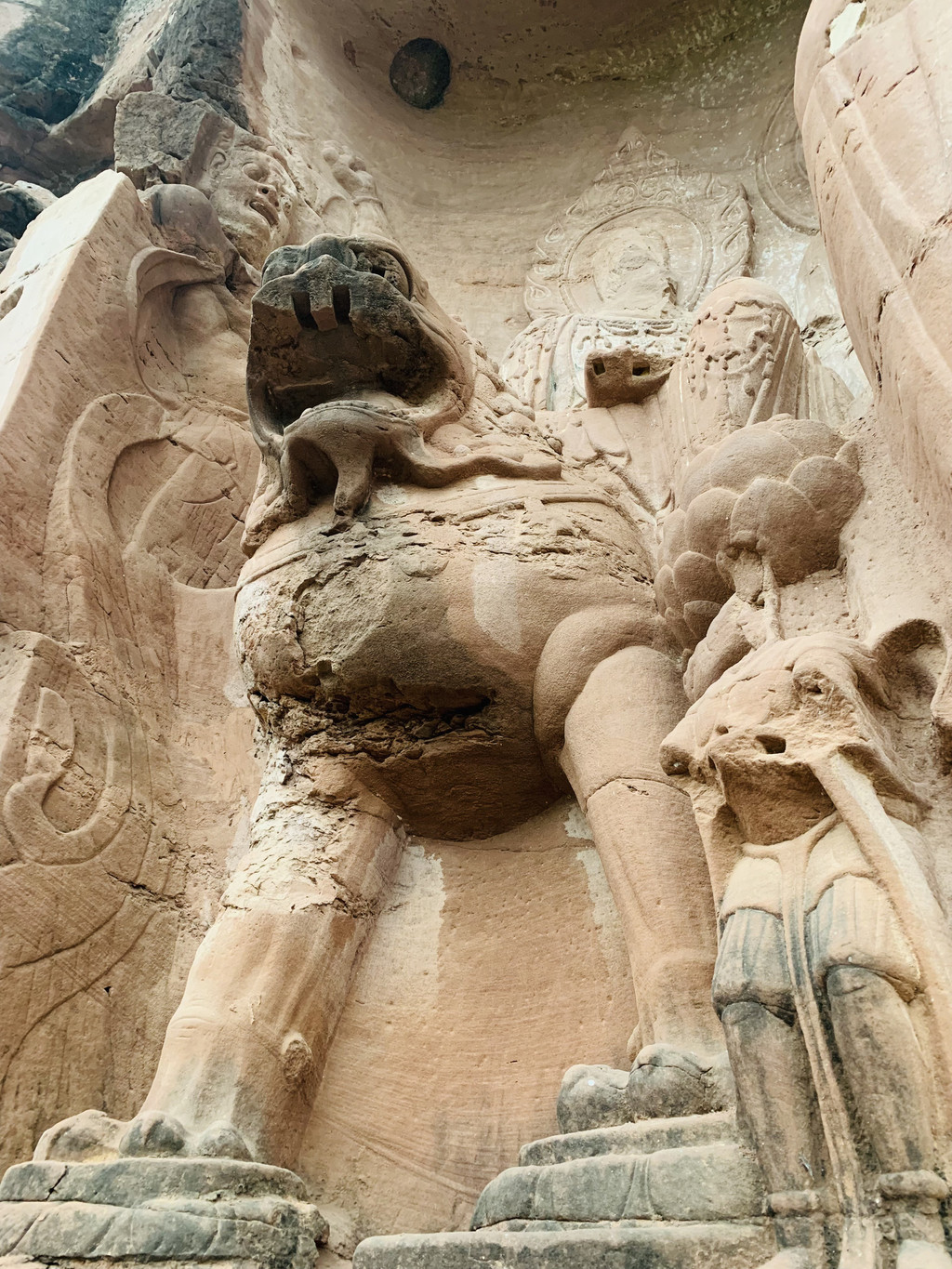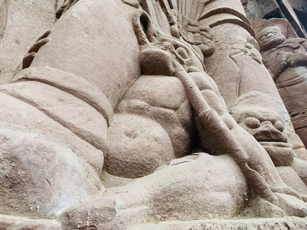 3.特点:(1)雕刻工艺。这是看了那么多石窟,第一次先提工艺,手法确实太妙了,尤其是锁着的最后一窟“华严三圣”,堪称石刻艺术的巅峰之作。简单的一佛二菩萨二尊者方窟造像,造像古朴大方,雕刻极为细腻,每一尊都极尽妍态。特别是普贤坐骑大象,象鼻扭曲,张嘴哈气,栩栩如生,旁边文殊的坐骑雄狮屹立,仰首怒吼,威风凛凛,文殊普贤,分别一脚下胯,足踩莲花,怡然自得,风度翩翩;中间主佛—释迦摩尼,法相庄严,低眉浅笑,望之生畏,刀法极为圆润,是中晚唐风格淋漓尽致的展现,几乎等于缩小版的龙门卢舍那;近旁力士遒劲有力肌肉线条明显,腿部小鬼抱足,嘴衔神鞭,更把力士威武勇猛的形象衬托出位。整龛着色已退,但技法深邃,真真是鬼斧神工,这种宝贝在任何景区都是要大书特书的典范景点,却深藏邛崃山脉鸡犬相闻的田野间,不为人知。