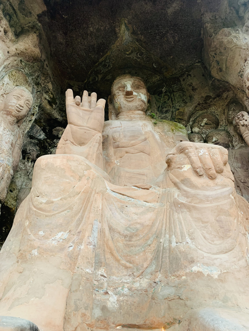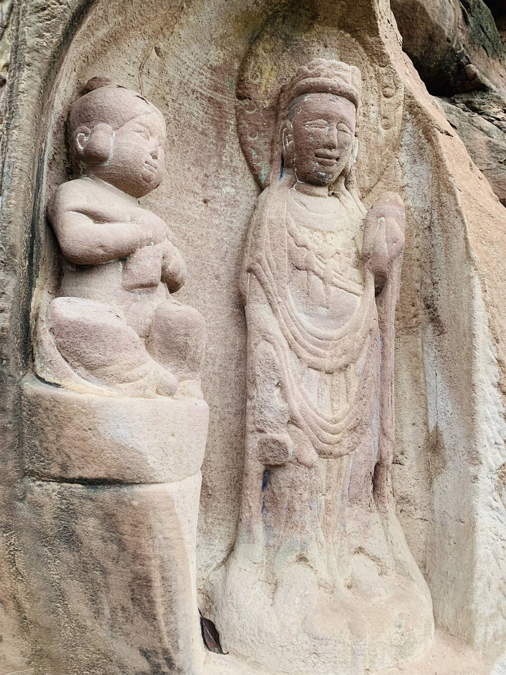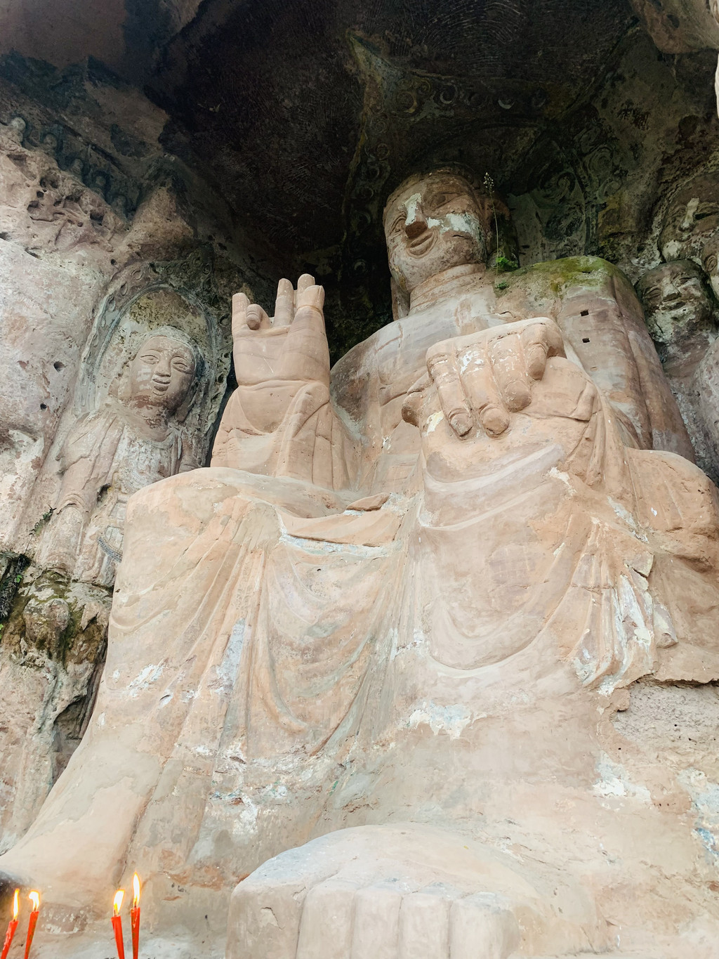 (2)大佛。半壁山坡之上有大佛一尊,在未上锁的尽头处,可能因为礼佛需要而未封闭,雕刻同样精细,特别是火焰纹座,上靠顶部,着色依稀可见,斑驳之中尽显细致的纹路,主尊同样圆润可亲,但面部稍显呆滞,不如华严三圣方窟,左右尊者面容粗糙,迦叶更是雕的逗比,反倒是左右竖立的菩萨形象婀娜多姿,较为可观。主尊弥勒佛怀疑文革受到过破坏,腰腹部以下为水泥重补的,这种情况在资阳半月山大佛我也见过,但这儿外漆采用了四川盆地特有的紫色土,整体看着依然有红砂石的感触,修旧如旧做的比安岳好多了。据说明牌子,唐武宗灭佛后,武则天时期雕刻弥勒佛的风气渐消,但四川地处偏远,信息更新不及时,中晚唐仍然雕刻的弥勒佛,此为题外话。