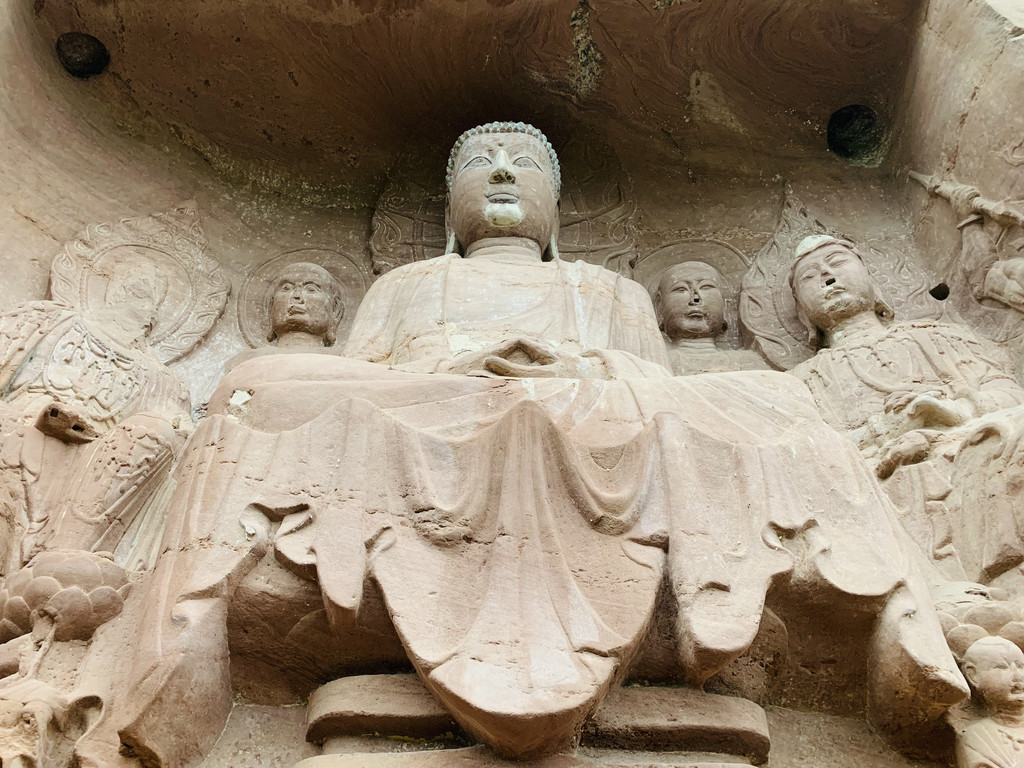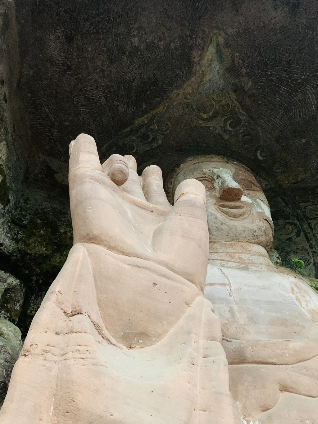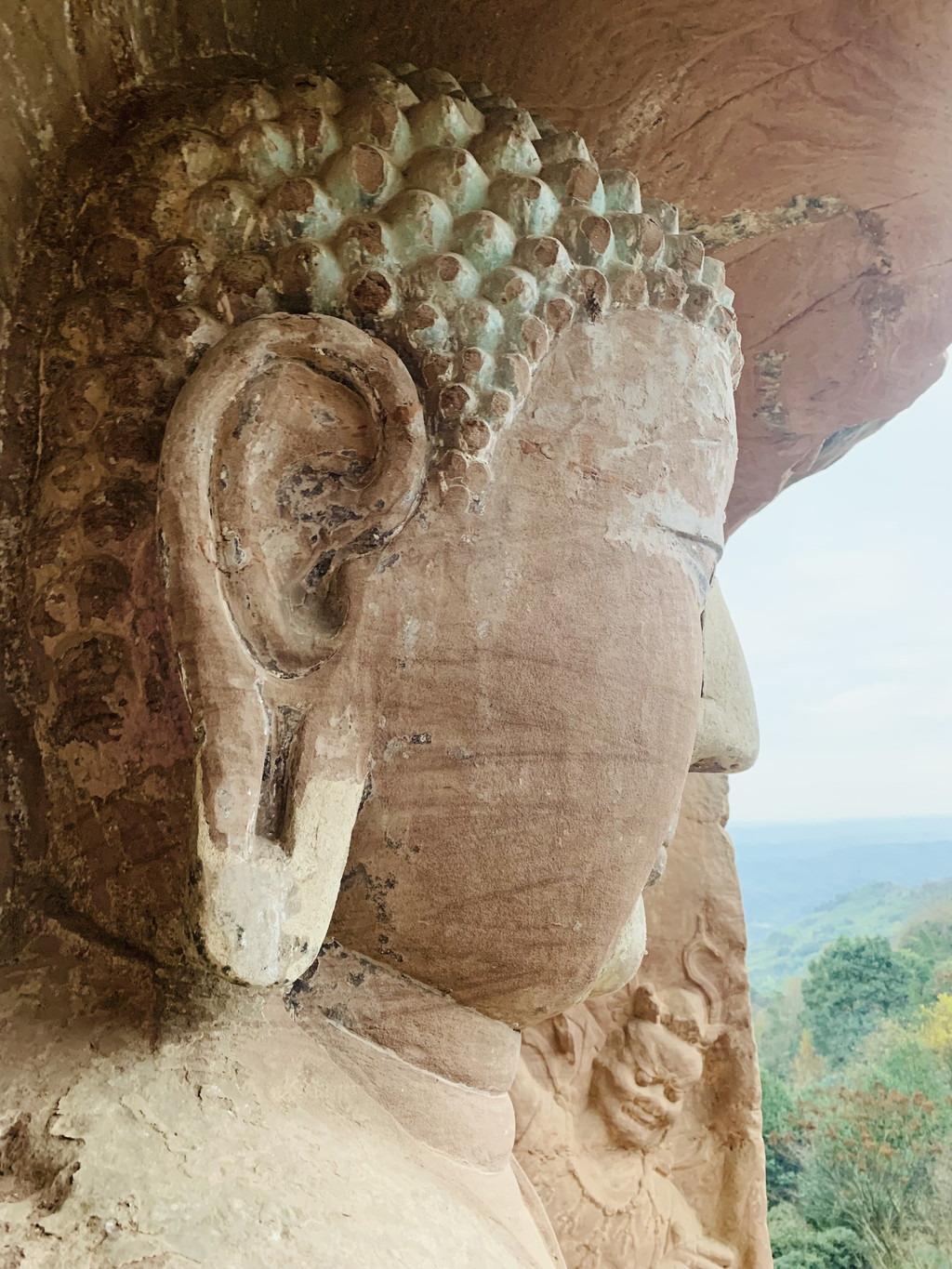 (2)大佛。半壁山坡之上有大佛一尊,在未上锁的尽头处,可能因为礼佛需要而未封闭,雕刻同样精细,特别是火焰纹座,上靠顶部,着色依稀可见,斑驳之中尽显细致的纹路,主尊同样圆润可亲,但面部稍显呆滞,不如华严三圣方窟,左右尊者面容粗糙,迦叶更是雕的逗比,反倒是左右竖立的菩萨形象婀娜多姿,较为可观。主尊弥勒佛怀疑文革受到过破坏,腰腹部以下为水泥重补的,这种情况在资阳半月山大佛我也见过,但这儿外漆采用了四川盆地特有的紫色土,整体看着依然有红砂石的感触,修旧如旧做的比安岳好多了。据说明牌子,唐武宗灭佛后,武则天时期雕刻弥勒佛的风气渐消,但四川地处偏远,信息更新不及时,中晚唐仍然雕刻的弥勒佛,此为题外话。