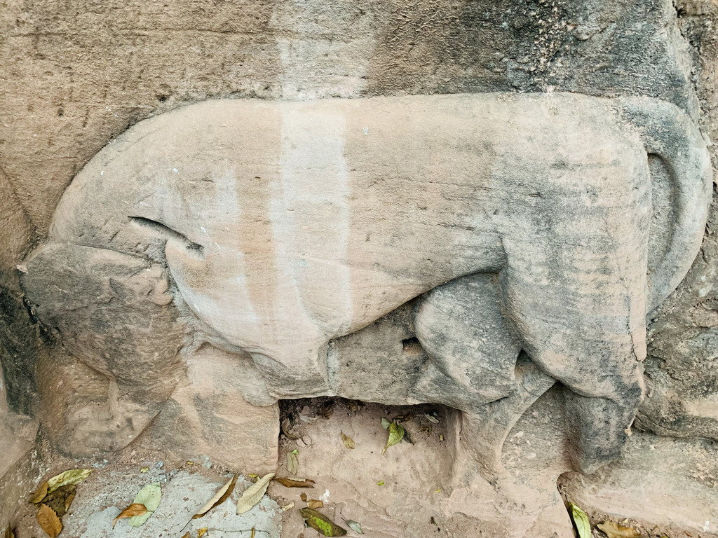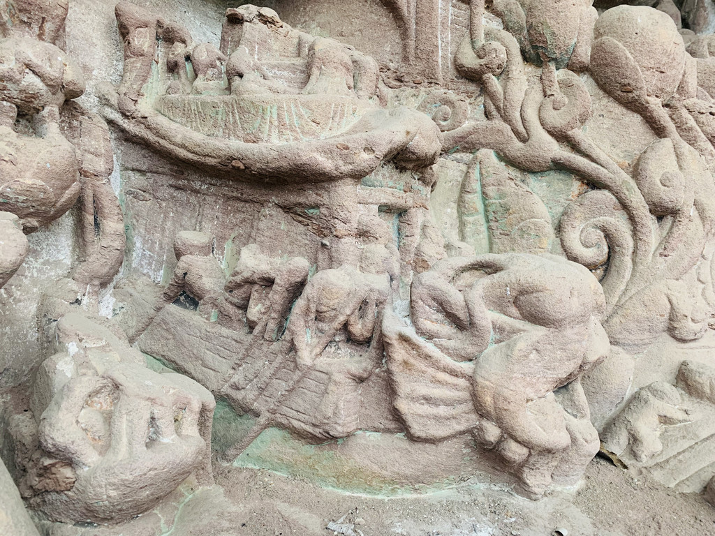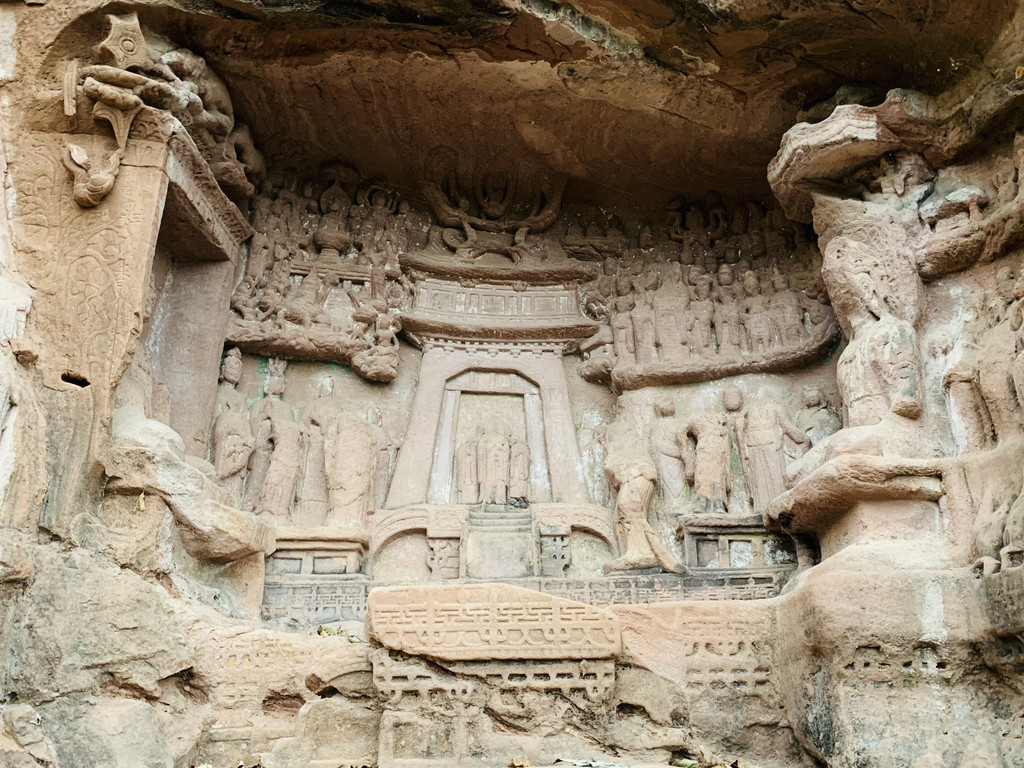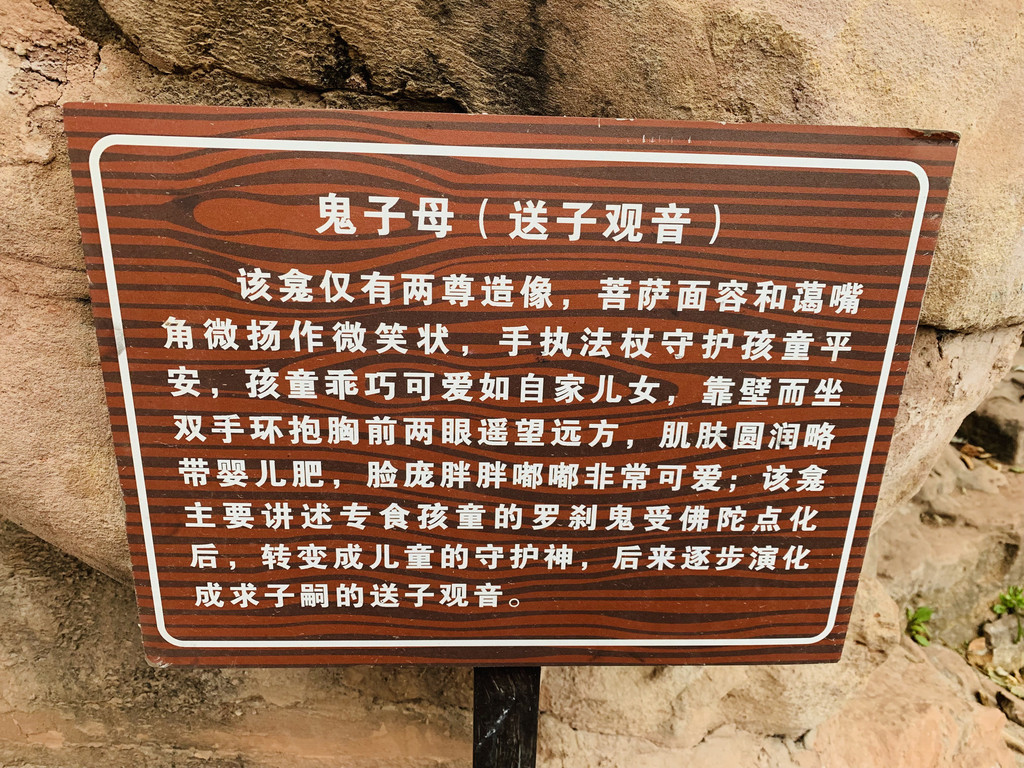 (3)其它方窟。邛崃的石窟特点就是方窟,题材大多是常见的经变等,重点是细节突出,这是最考验刀工的。举例:此龛为辩法场景,左右两边为主尊,中间反而是陪衬,但陪衬的地方雕刻了天上宫阙的建筑与围观的仙尊,特别是在左边尊者上方居然还雕了大象与马匹,此种塑造仅此一处;此龛下有龙船造型,人摇船者奋力揖桨,画面感很强;送子观音(鬼观音)龛中,为彰显送子主题的小孩特意塑造为憨态可掬的胖嘟嘟形象,体现了古朴的求子意蕴,还有很多细节,说明牌上有简单介绍。