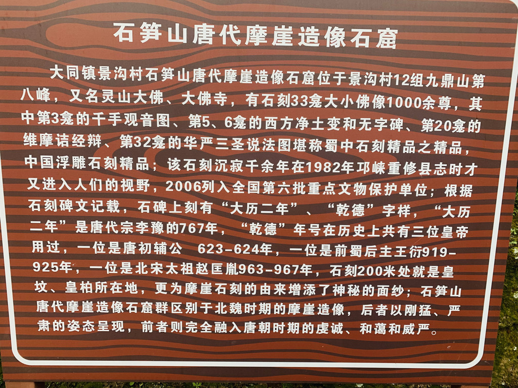 2021年游记一共写了6万5千字,我把最后一篇献给压轴出场的邛崃石笋山石刻,因为这个千秋造像的名气和实力严重不符,游客知之甚少,今日为石笋山正名。邛崃石笋山是成都全域23处全国重点保护之一,准确说是之一的之一,它和邛崃花置寺摩崖、磐陀寺摩崖打包申请的国保,但就去过的盘陀寺来说,石笋山实力碾压后两者,单独申请国保没有问题。中晚唐时期的石笋山石刻,距今1300年左右,没有带太多明清时期川内石像重新上漆的风潮,单纯的风蚀脱色使得它保留了千年前质朴的光辉,从雕刻工艺上,堪称全国一流,胜过很多出名的石刻。