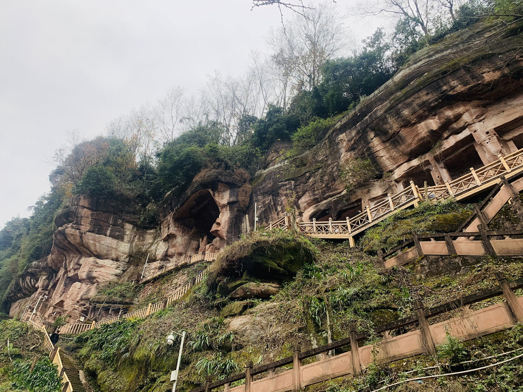 (4)零距离接触。当地文保部门为观赏方便,半山之中修筑了石梯栈道,方便信众的同时,也可以让游人几乎零距离接触石窟,有的塑像可以手轻抚表面,指触石像,宛若千年,历史的沧桑尽显于此,观感远胜很多著名石窟。