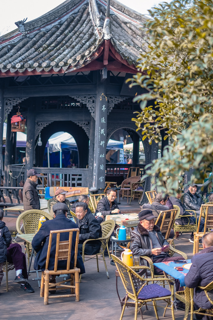 如果说古城带着一些对游客的照顾,多了些“网红打卡”的气质,那 邛崃 人自己的“老公园”,则是文君井园林,在高墙院落的保护下,园林内亭台楼阁、曲径蜿蜒,曾经卓文君和司马相如当垆卖酒的地方,成了人们休憩娱乐的院坝,院坝上的三要素:牌、竹椅和盖碗茶,是刻在 四川 人DNA里的组成部分,喝茶能解决 四川 人一大半的问题,如果不能,就换个地方喝茶。
