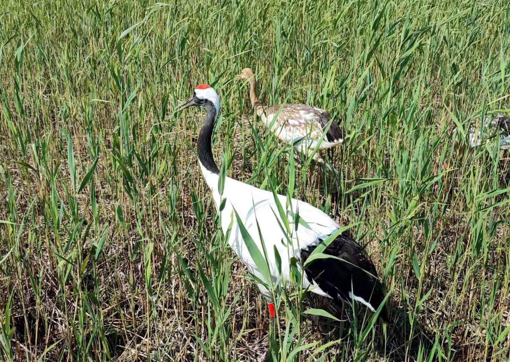 除了丹顶鹤,在扎龙自然保护区还能看到白鹤、白头鹤、白枕鹤、蓑羽鹤等珍禽。这是芦苇荡中的丹顶鹤母子。