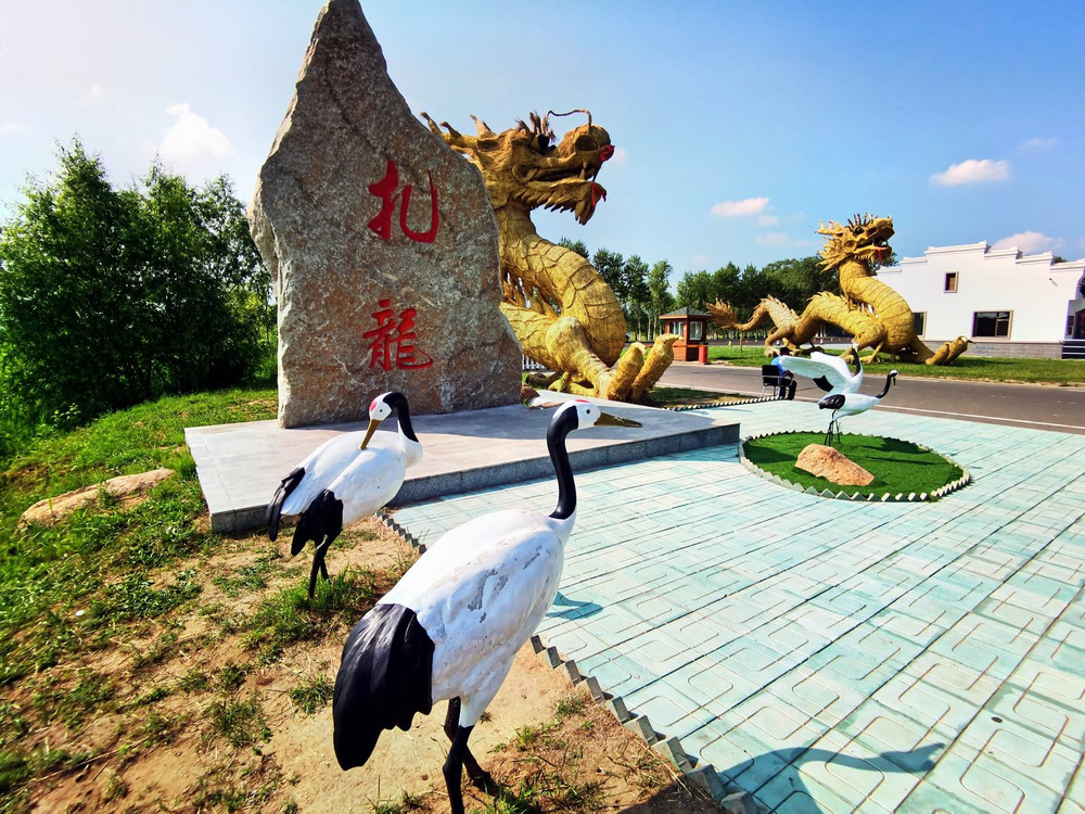 扎龙国家级自然保护区位于黑龙江省西部、齐齐哈尔市东南部松嫩平原、乌裕尔河下游湖沼苇草地带。图为扎龙自然保护区入口处的巨龙雕塑。