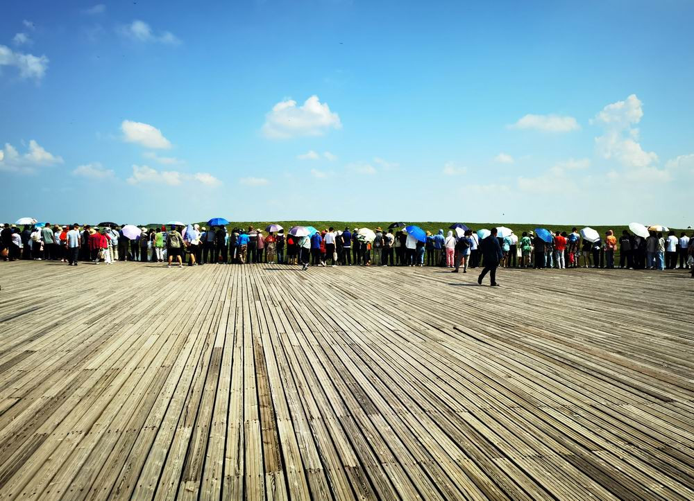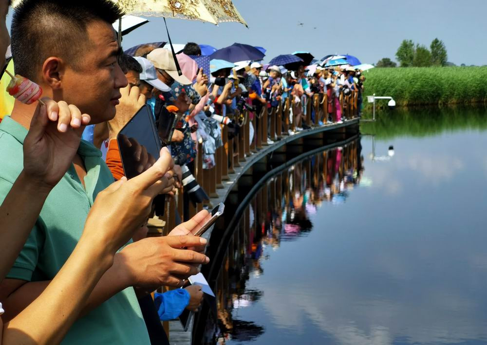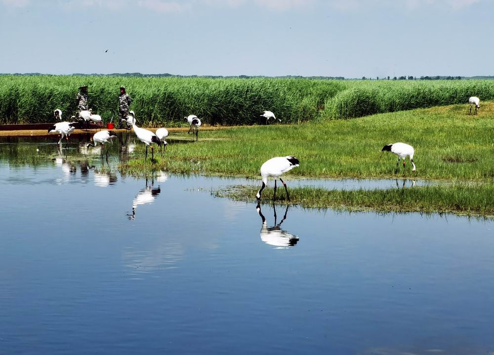 大约步行30分钟,就能抵达丹顶鹤野生驯养和放飞区。游客们都沿着人工修缮的木栈道等待着。