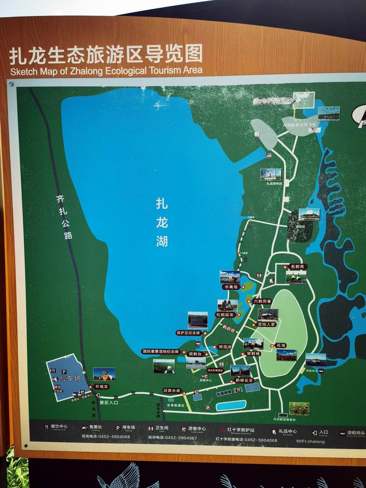扎龙国家级自然保护区南北长80.6公里,东西宽58.0公里,总面积21万公顷。属湿地生态系统类型的自然保护区。图为扎龙国家级自然保护区导览图。