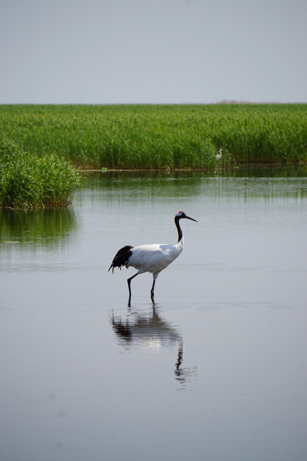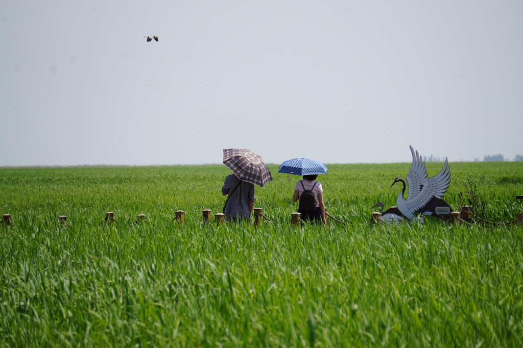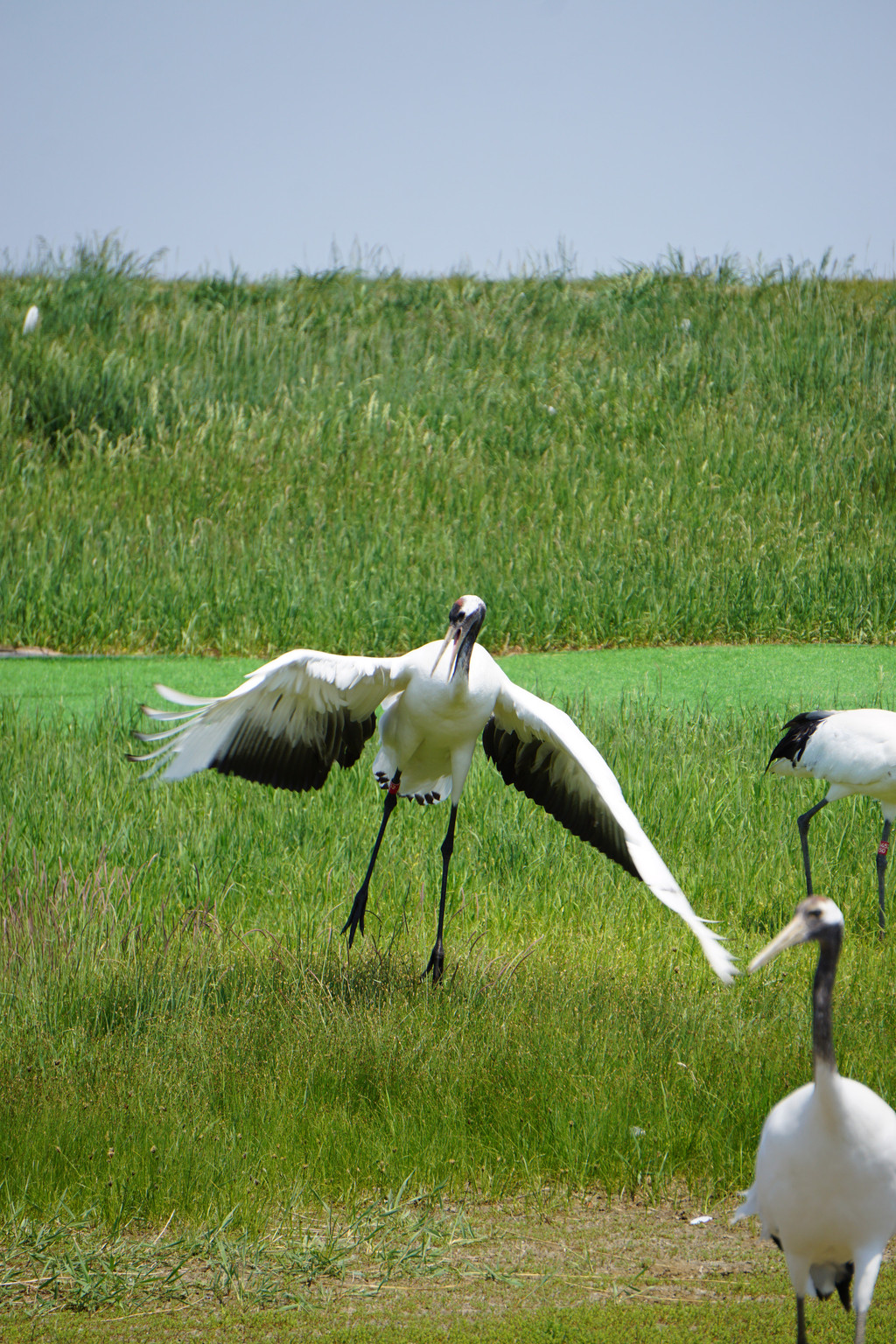 下了车还有2公里步行,沿着芦苇荡走在栈道上,景色还是很美的,就是特别暴晒,没遮没挡,走到野化驯养放飞区等11点的放飞,前排人山人海,几个丹顶鹤溜溜哒哒的营业,先是仙鹤仙子坐着小船出来跳了支舞,然后就是放飞表演。