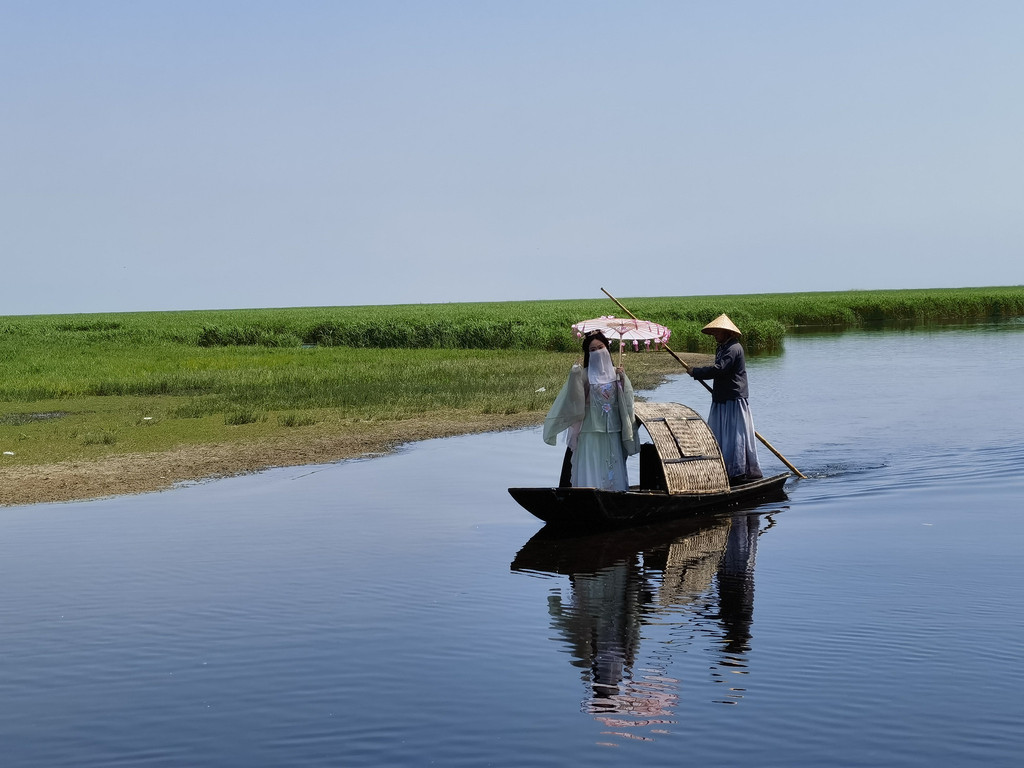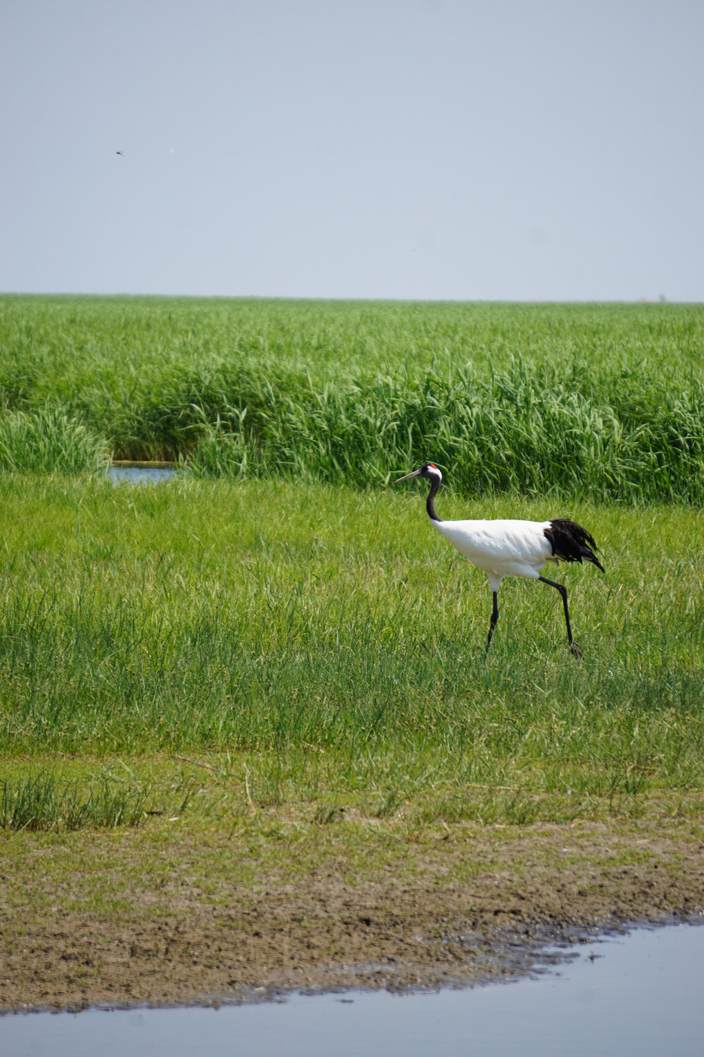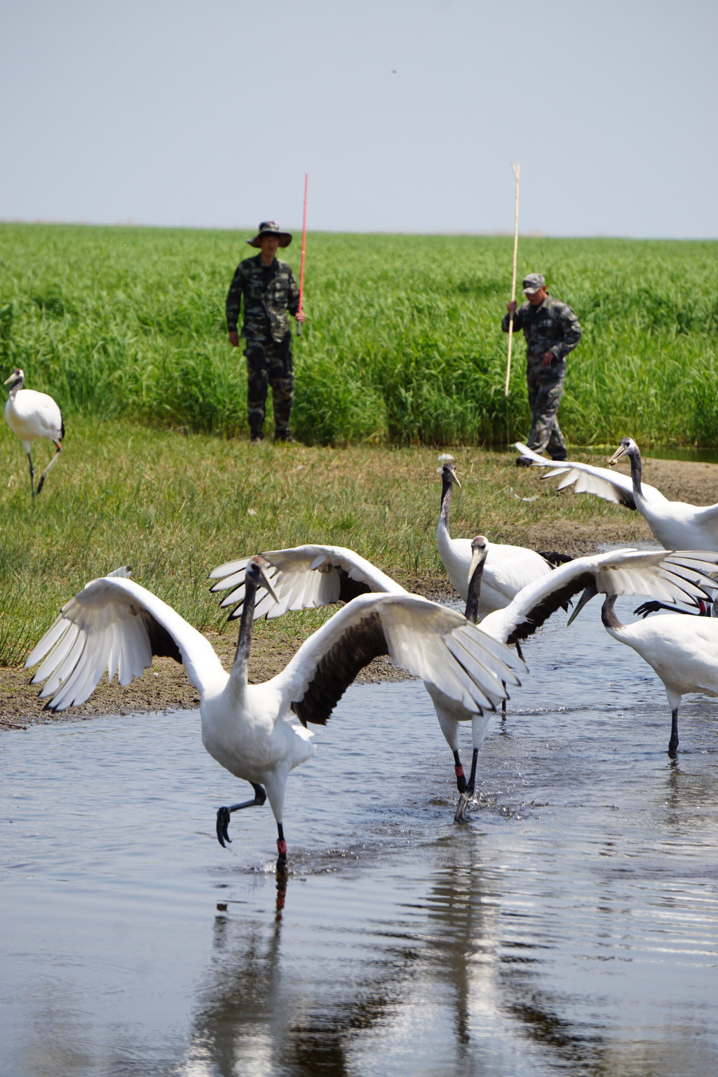 下了车还有2公里步行,沿着芦苇荡走在栈道上,景色还是很美的,就是特别暴晒,没遮没挡,走到野化驯养放飞区等11点的放飞,前排人山人海,几个丹顶鹤溜溜哒哒的营业,先是仙鹤仙子坐着小船出来跳了支舞,然后就是放飞表演。