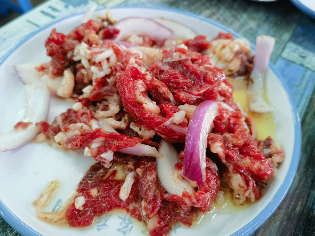 门口支了摊子,我俩直接坐下了,之后才知道前边还有等位呢,我俩点了上脑和家庭拌肉,还有宫后夹肉和宫后,宫后夹肉是牛腩部分,宫后是筋。