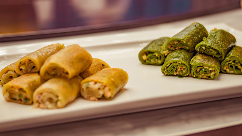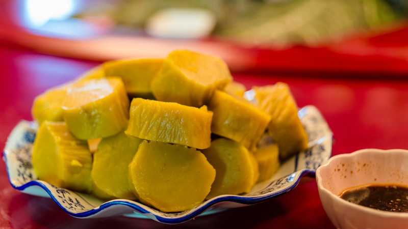 磨斋色泽金黄、爽口弹牙,颜色来自槐花,主料是大米,加上一种在烧完后的草灰过滤了的灰水,在锅中炒至而成,配上辣椒蘸水,美味~~