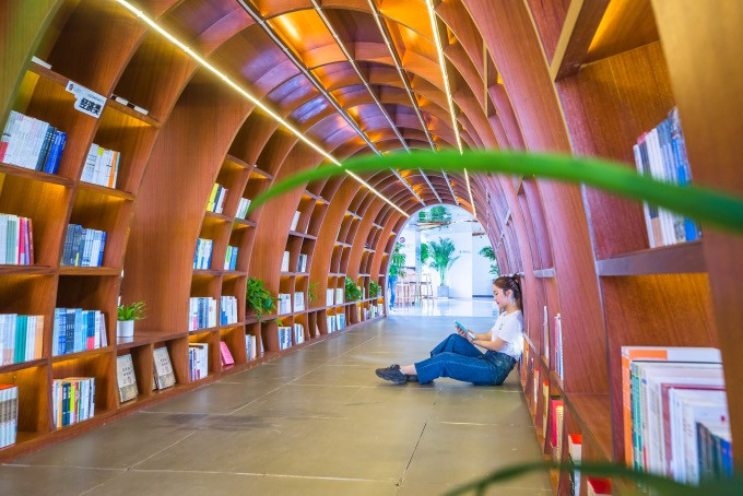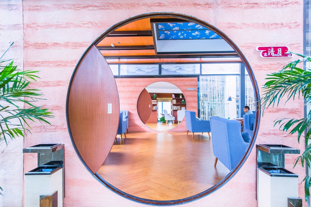 圆形隔断颇有苏州园林的建筑美感,一个个弧度延续下去,延伸出无限空间,似乎也给了人许多遐想的余地,仿佛文字之美,每一字每一句都承载着无限美学。当人们翻阅时,总能心生感动。