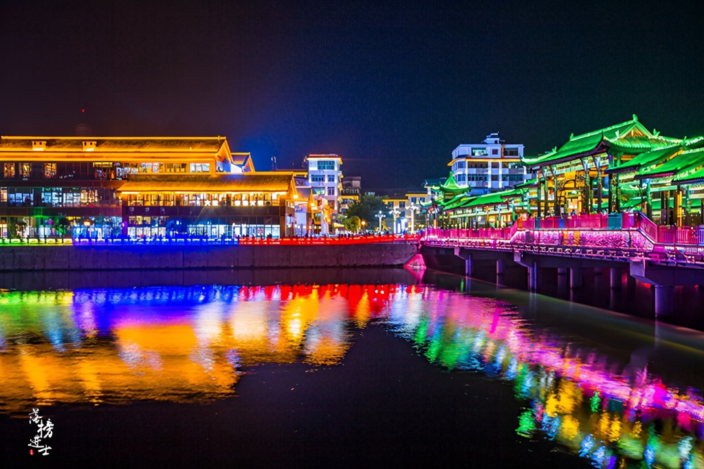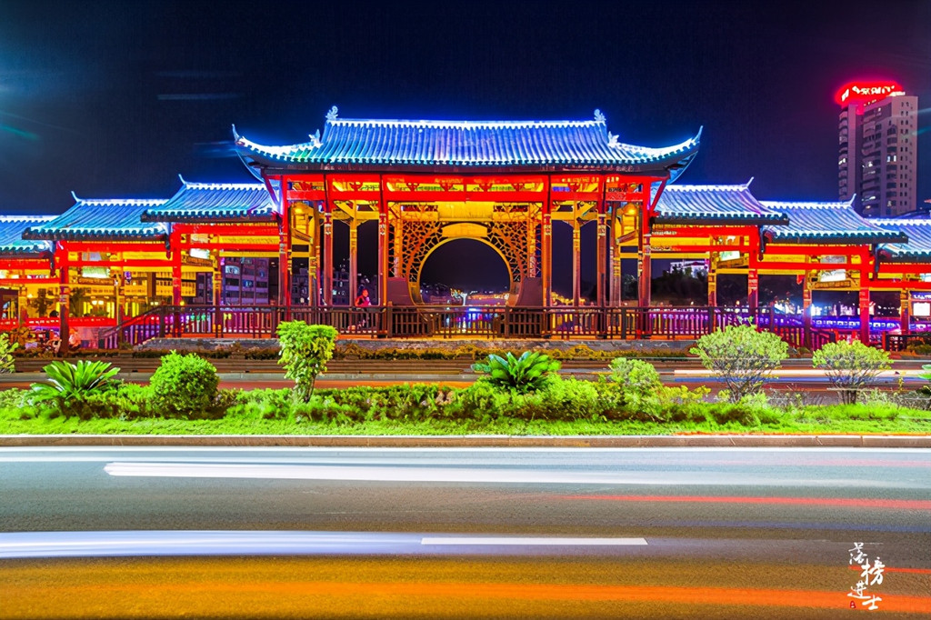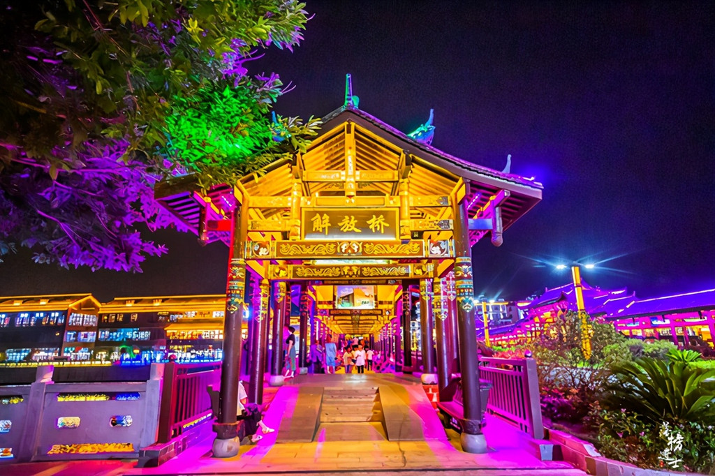每当夜幕降临,华灯初上,璀璨的灯光便会照亮解放桥的飞檐翘角、雕花木窗。远远看去,整座廊桥宛如一道亮丽的彩虹,充满了独特的古典美。