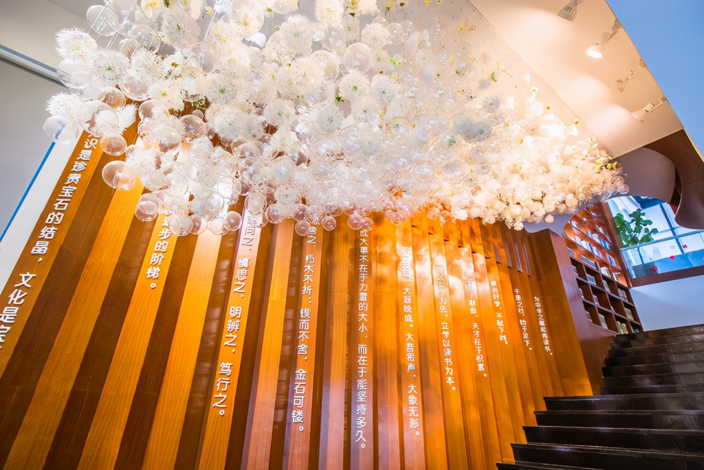 书简式样的隔断上工整装饰着古今中外各种箴言,玻璃球装饰的灯具投射下略带浪漫色彩的光芒,缓缓向上的步伐仿佛是一个渐入佳境、走入心灵深处的过程。