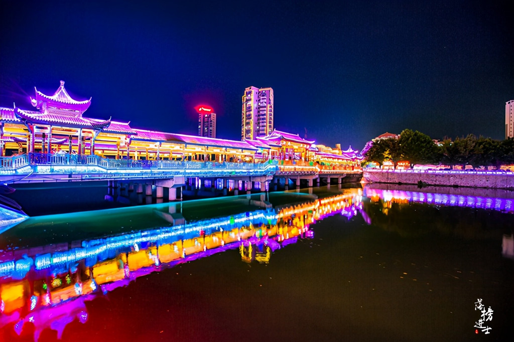温柔夜幕下,桥依偎着水,水映衬着桥,灯光变幻间,有着说不完的故事,道不尽的情结。