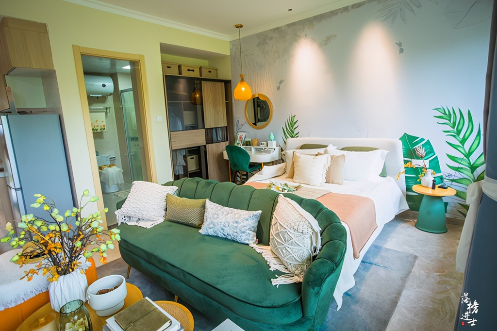 度假酒店的房间设计想必是出自细腻的女性之手,布置得整洁温馨,随处可见的绿色调打造出小清新的氛围,和外面大自然的颜色遥相应和。柔软的沙发,舒适的床铺,精致的梳妆台和大大的冰箱,如果不说,这哪里是酒店客房,明明是某个文艺少女的闺房。