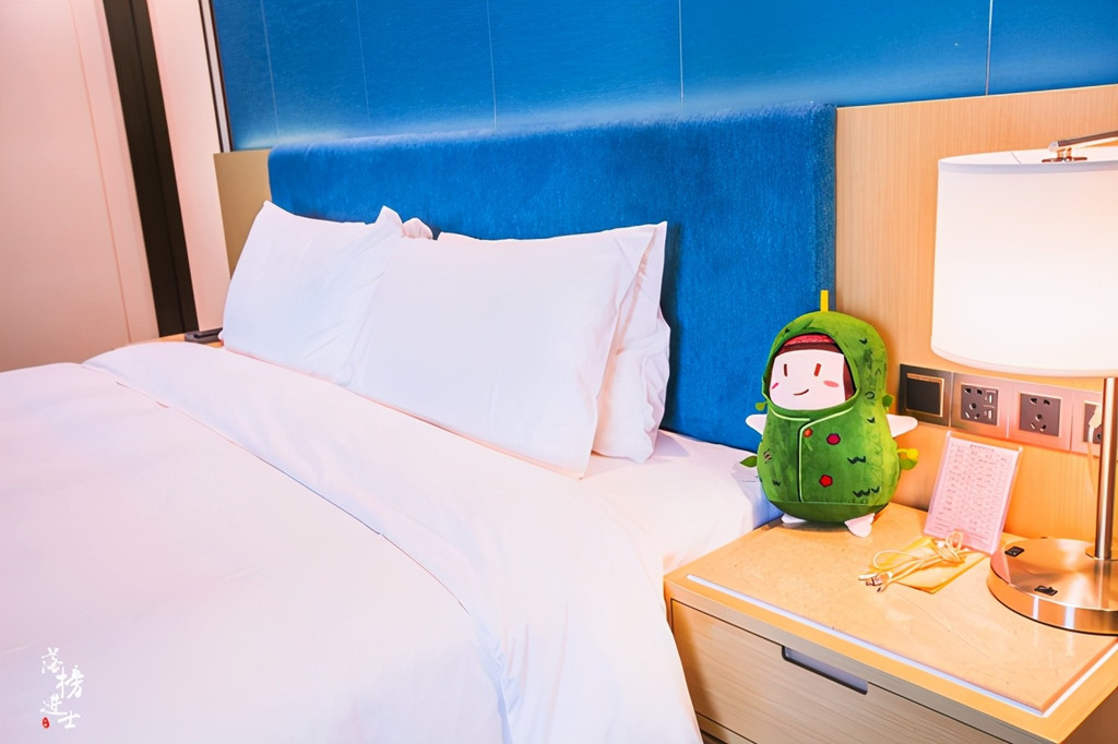 房间面积宽敞,地毯走上去舒适感十足。由集团统一定制的床品整洁温馨,躺上去整个人似乎被温柔拥抱。更特别的是房间里还有激光投影影音系统,选一部喜爱的电影投影在大屏幕上,自动窗帘缓缓合上,就打造出一个只属于你自己的电影私密空间。