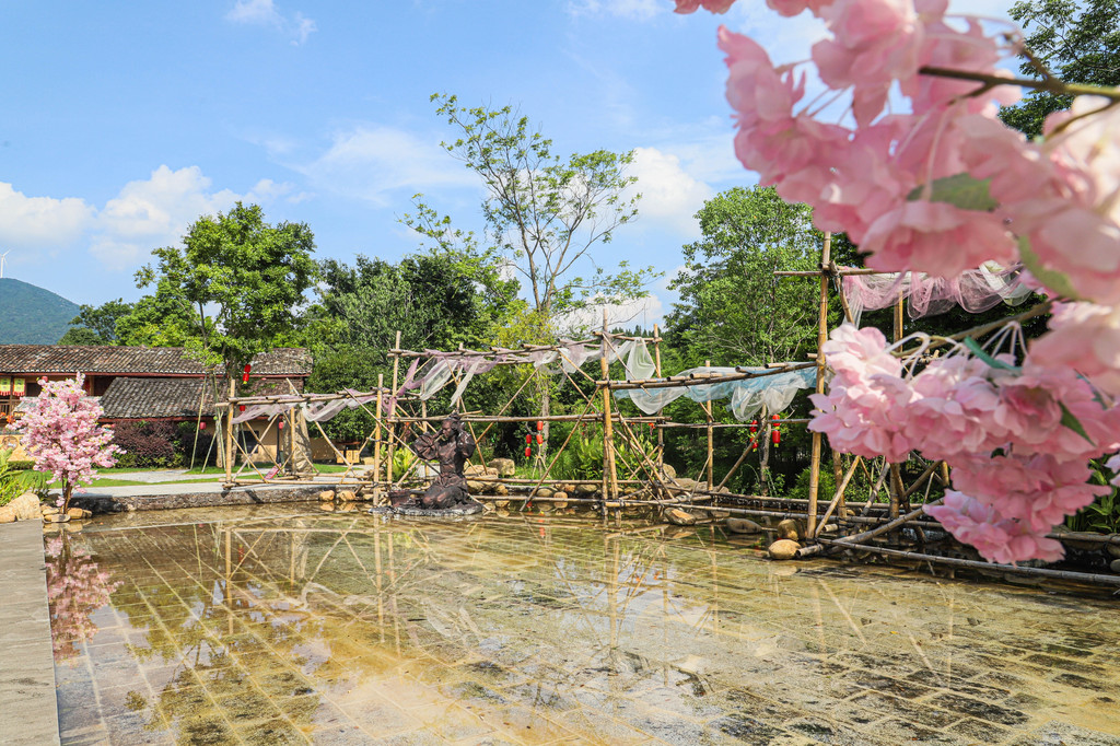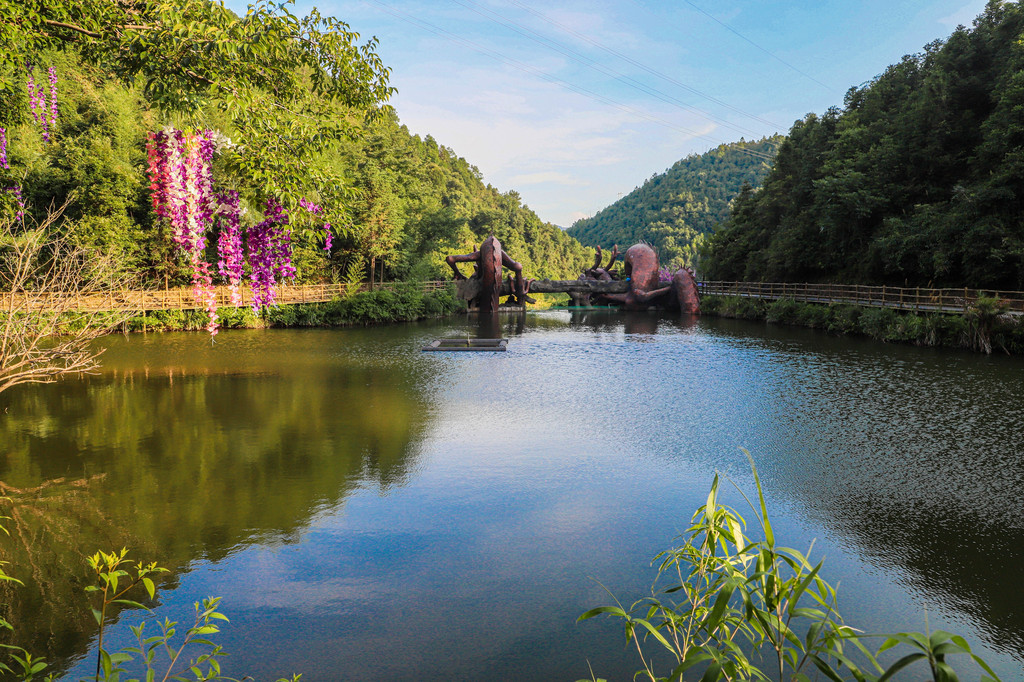 桃江水在度假区内逶迤,桃江两岸以风光秀美著称。泛舟江面,闭上眼,耳边只闻鸟兽虫鸣,整个世界安静得似乎孤身一人;睁开眼,却撞见整个天地,花草树木无不生机勃勃。