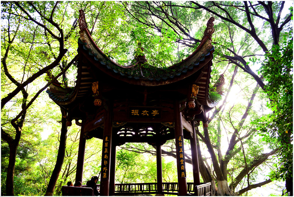 转过山弯,在三条山径交汇处一小亭兀立,匾额曰“振衣亭”,两侧楹联“长留王谢堂前燕,来筑泉南郭外巢”。至此,稍作停歇,然后下山。