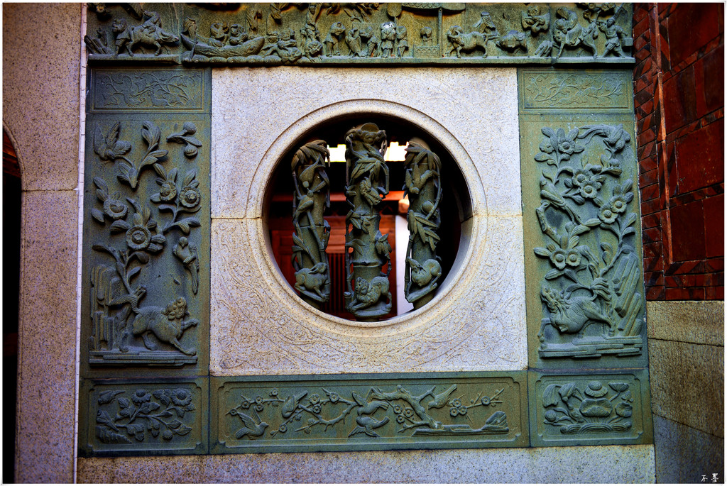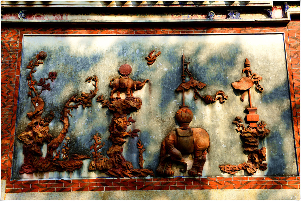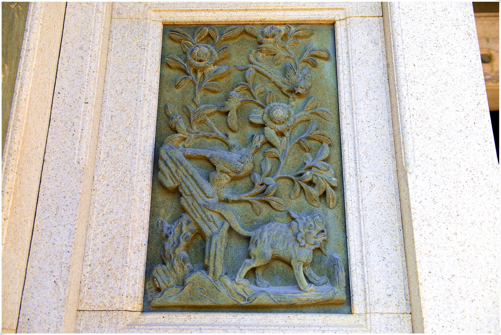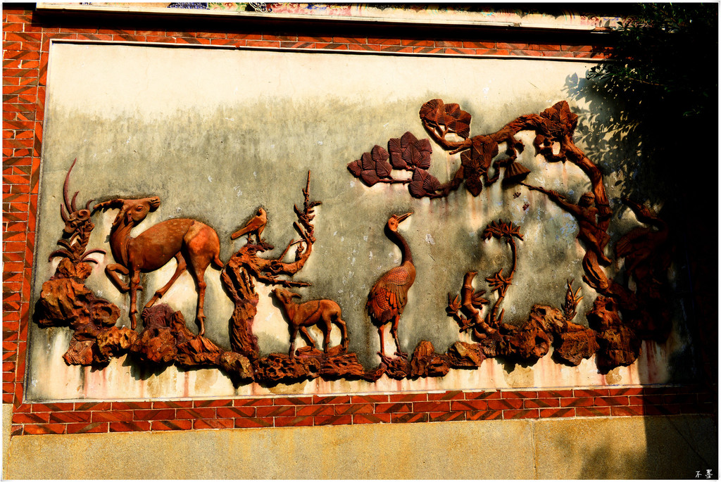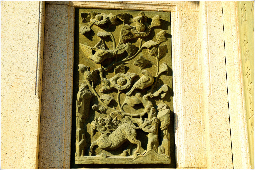 神兽两侧嵌有砖雕的大象、葫芦、鹤、鹿、灵芝、牡丹等,雕刻精美,栩栩如生,象征福禄寿喜、欣欣向荣。