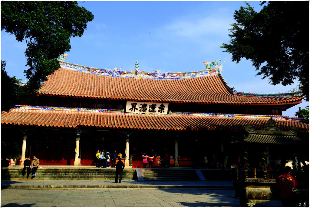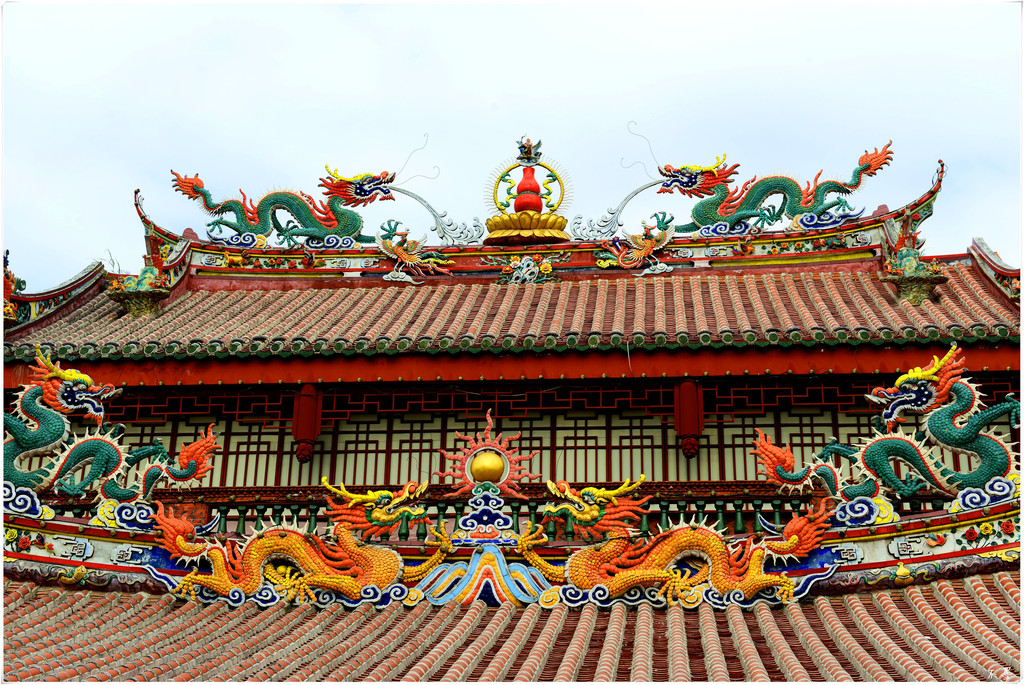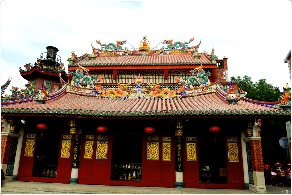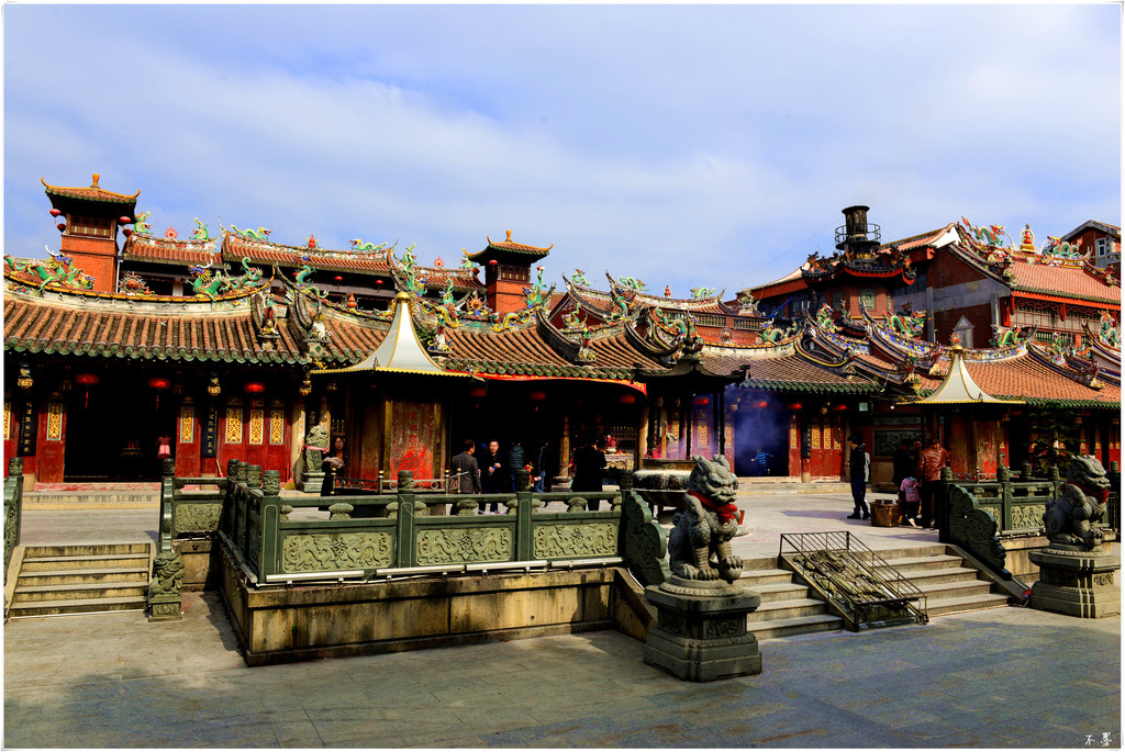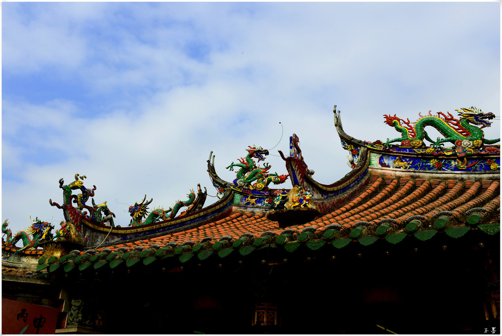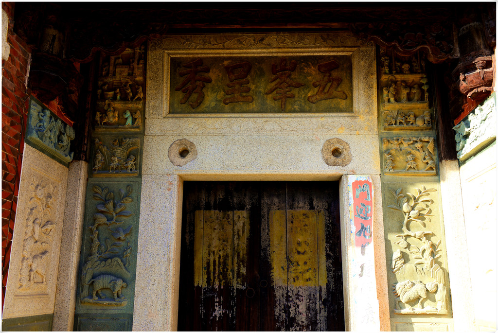 整个建筑雕梁画栋、器宇轩昂,精美的木雕、石雕和泥塑是最大的亮点,屋脊的剪瓷龙雕,造型生动夸张、色彩艳丽,其间配有花鸟走兽,把闽南古建筑的艺术风格表现得淋漓尽致。