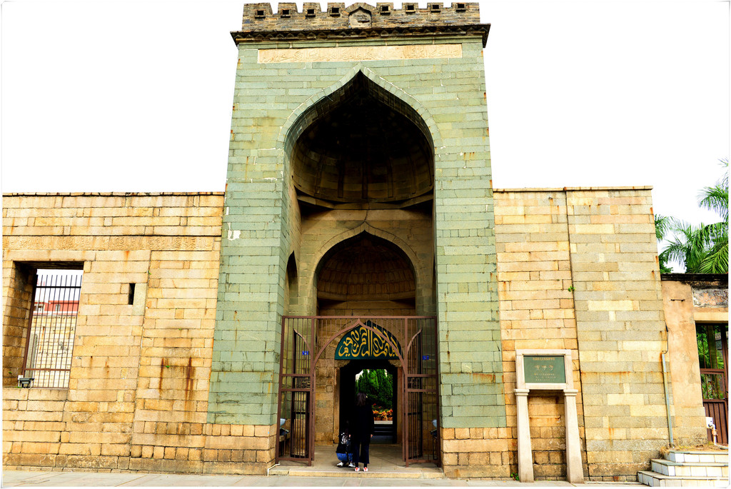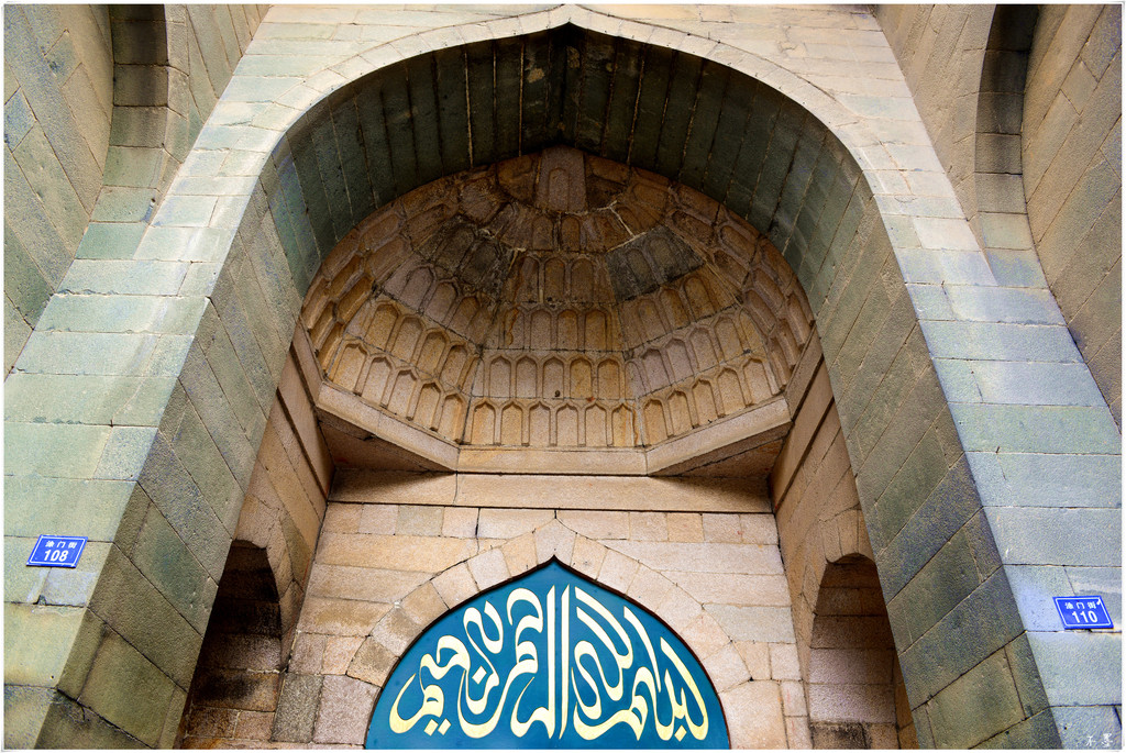 与门楼相连的大殿称奉天坛,是穆斯林礼拜的地方,门楣部分雕刻有阿拉伯文《古兰经》。奉天坛屋顶原为巨大的圆顶,不幸的是圆顶在明万历年间地震中坍塌,徒留大殿四壁和窗户,殿内的柱基、柱础大部分留在原地,算是一个纪念吧。