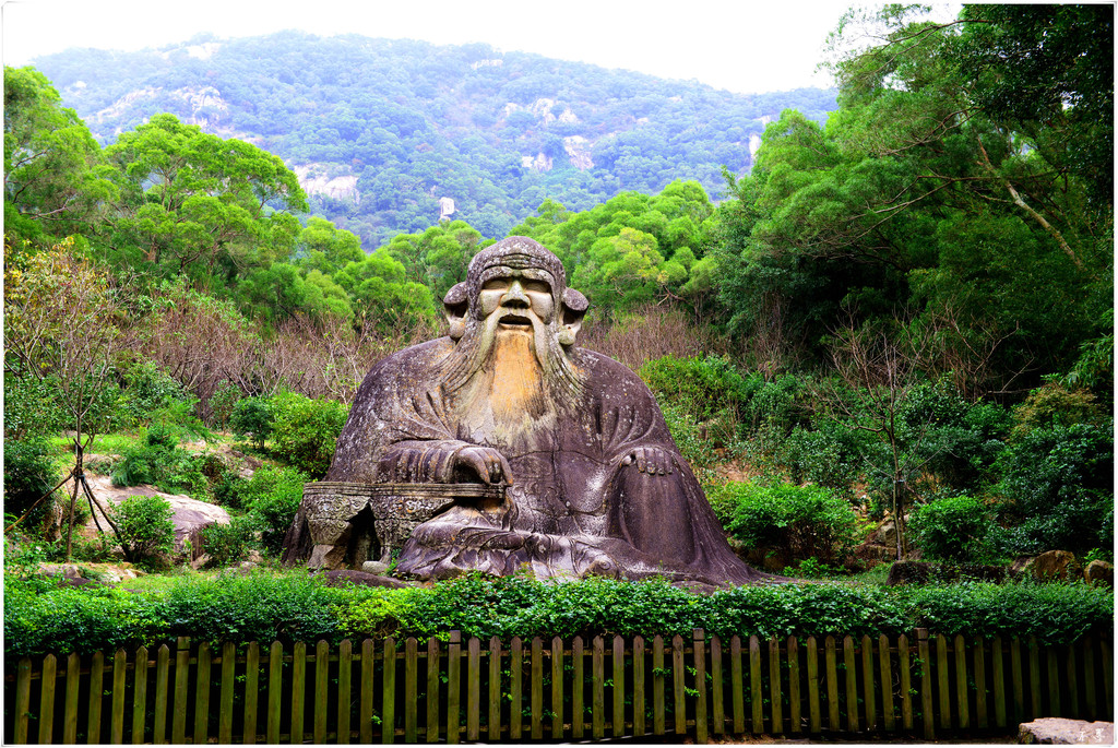 进山门,沿幽静的林荫石径向前,如宝座般的山间平台上,一尊石塑雕像泰然端坐。这就是被称为“老子天下第一”的老君造像。