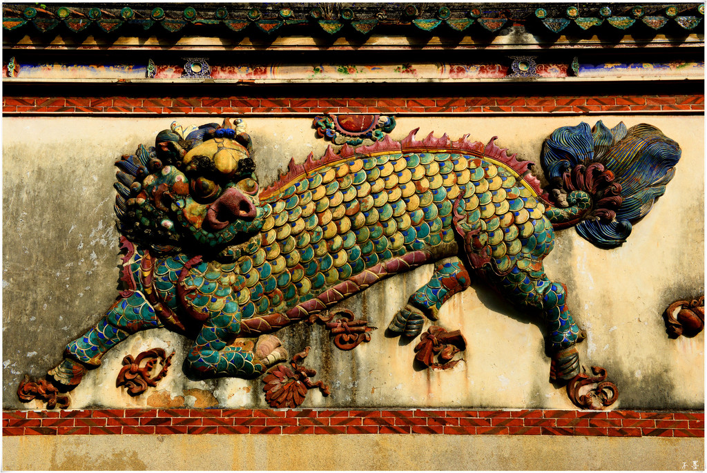 关于照壁上的这只神兽,一说是麒麟,龙首牛尾,麟身偶蹄,脚踏元宝、如意等吉祥物。一说是僋(同贪),一种独角兽,人心不足蛇吞象,贪心不足吞太阳,说的就是这家伙,一般起一种警示作用。