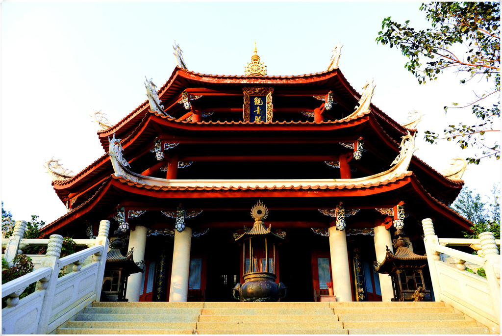 泉州少林寺依山势而建,自南向北步步升高,大雄宝殿后,沿高高的石阶而上,是三层建筑的观音阁,阁内的巨型观音菩萨像由珍贵红木雕刻而成。