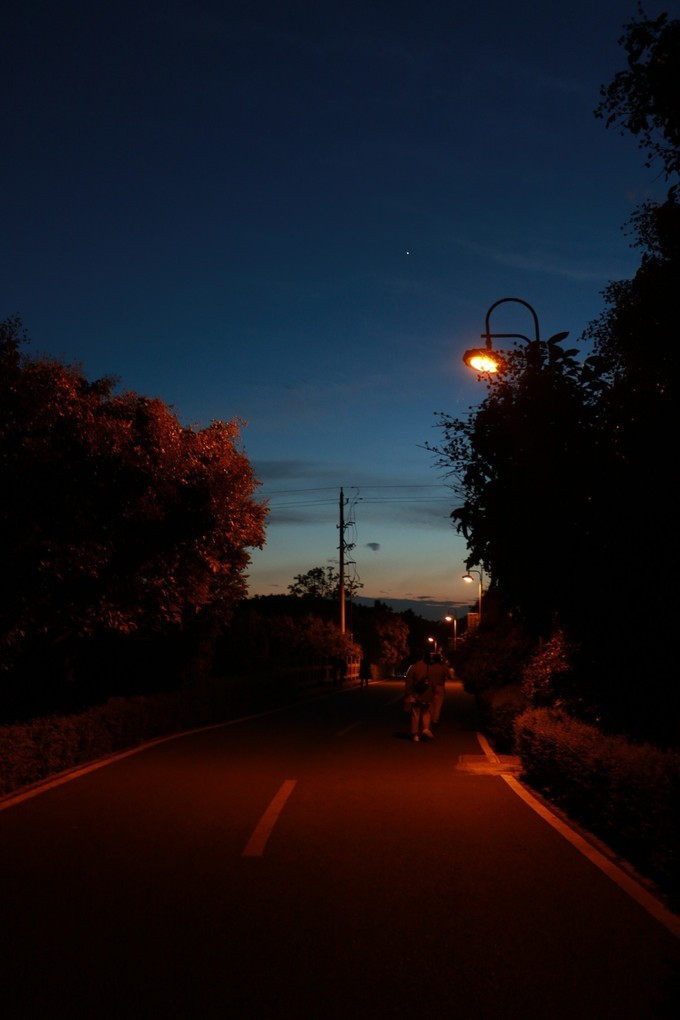夜幕之后的天湖略显平静,白日里耀眼的波光消失在夜色里,留下的是轻柔的湖水浮动,四周的游人环坐闲谈,欢声笑语徜徉在湖面,偶有几声鸟叫虫鸣,声声交错,奏成一曲清丽的歌,天湖静静地倾听。