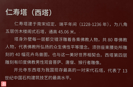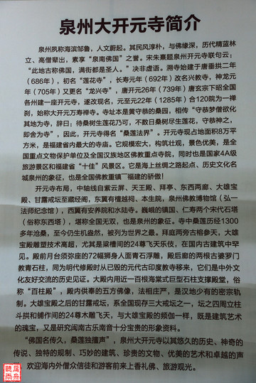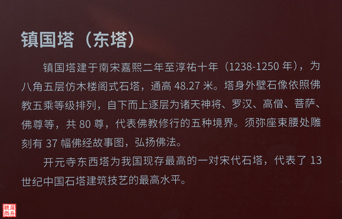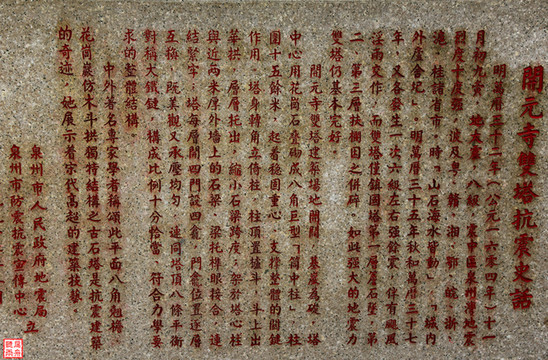 开元寺的镇寺之宝当属寺门内东西两侧的镇国塔和仁寿塔,两座宋代的古塔是我国现存最高历史最悠久的石塔,在一千多年中抵抗了数次七八级的地震而傲然屹立保存完好,可谓全世界建筑史上的奇迹。
