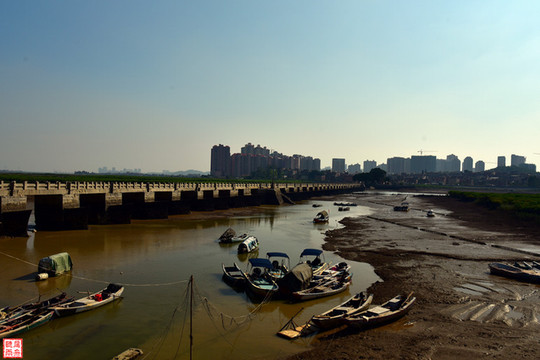 洛阳桥采用“筏型桥基”,在沿桥梁中线的河底下,用许多大石条垒成桥墩。这里水深流急,石条抛下去后就会被大水冲走。为了解决这一难题,能工巧匠们反复试验,待风平浪静,潮水低落时,同时出动装满石条的船只,把石条同时填进江里。就这样,在水底垒起了一座长500米,宽25米的桥基,长长的桥基宛如一条水下长龙,静卧江底。