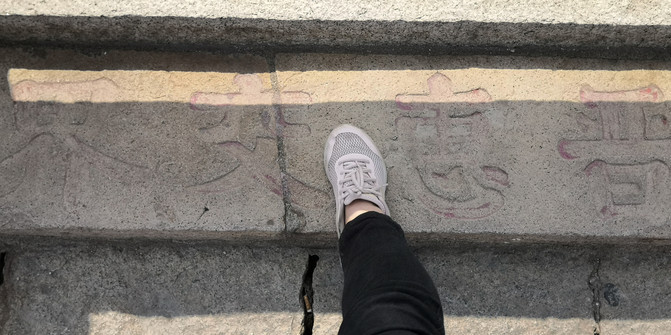 洛阳桥横跨惠安与晋江两县,在大桥中间设有界碑,于是拍下了一脚跨两县的照片: